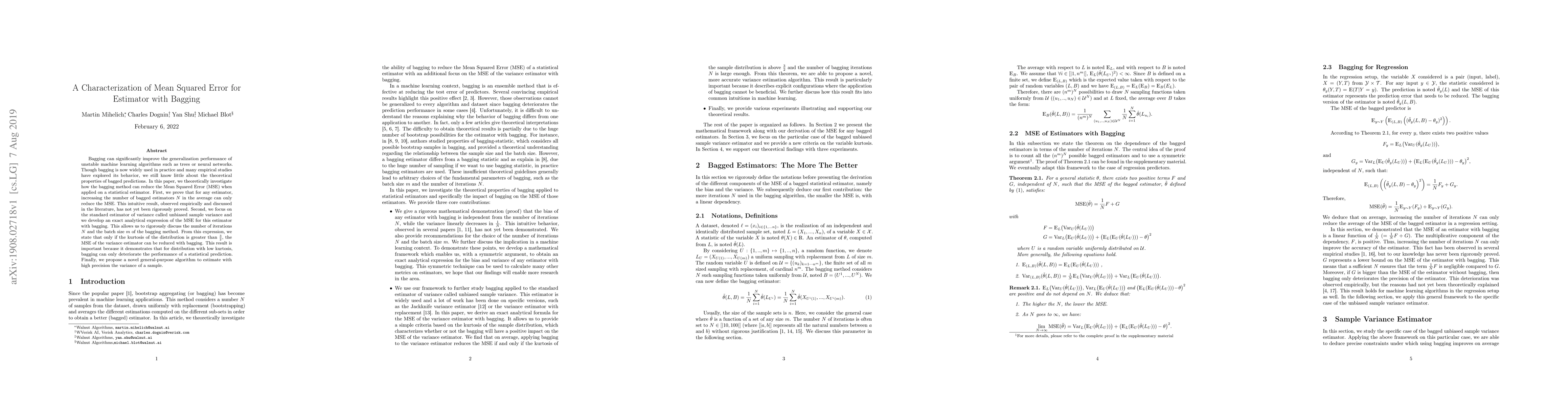 Bagging can significantly improve the generalization performance of unstable machine learning algorithms such as trees or neural networks. Though bagging is now widely used in practice and many empirical studies have explored its behavior, we still know little about the theoretical properties of bagged predictions. In this paper, we theoretically investigate how the bagging method can reduce the Mean Squared Error (MSE) when applied on a statistical estimator. First, we prove that for any estimator, increasing the number of bagged estimators $N$ in the average can only reduce the MSE. This intuitive result, observed empirically and discussed in the literature, has not yet been rigorously proved. Second, we focus on the standard estimator of variance called unbiased sample variance and we develop an exact analytical expression of the MSE for this estimator with bagging. This allows us to rigorously discuss the number of iterations $N$ and the batch size $m$ of the bagging method. From this expression, we state that only if the kurtosis of the distribution is greater than $\frac{3}{2}$, the MSE of the variance estimator can be reduced with bagging. This result is important because it demonstrates that for distribution with low kurtosis, bagging can only deteriorate the performance of a statistical prediction. Finally, we propose a novel general-purpose algorithm to estimate with high precision the variance of a sample.