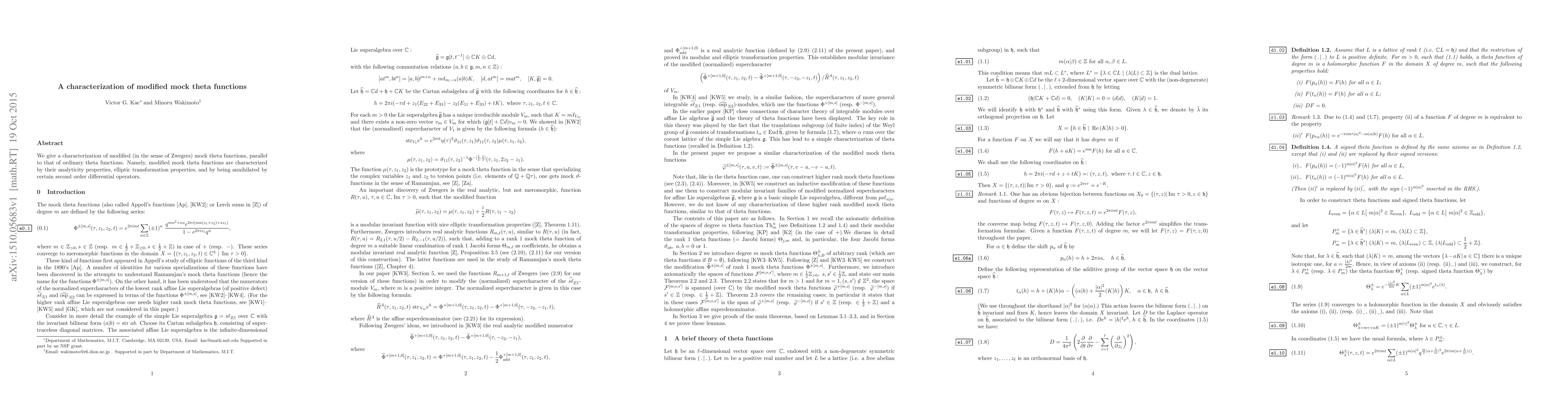 Summary: This paper characterizes modified mock theta functions by their analyticity, elliptic transformation properties, and annihilation by specific second-order differential operators, paralleling the characterization of ordinary theta functions.