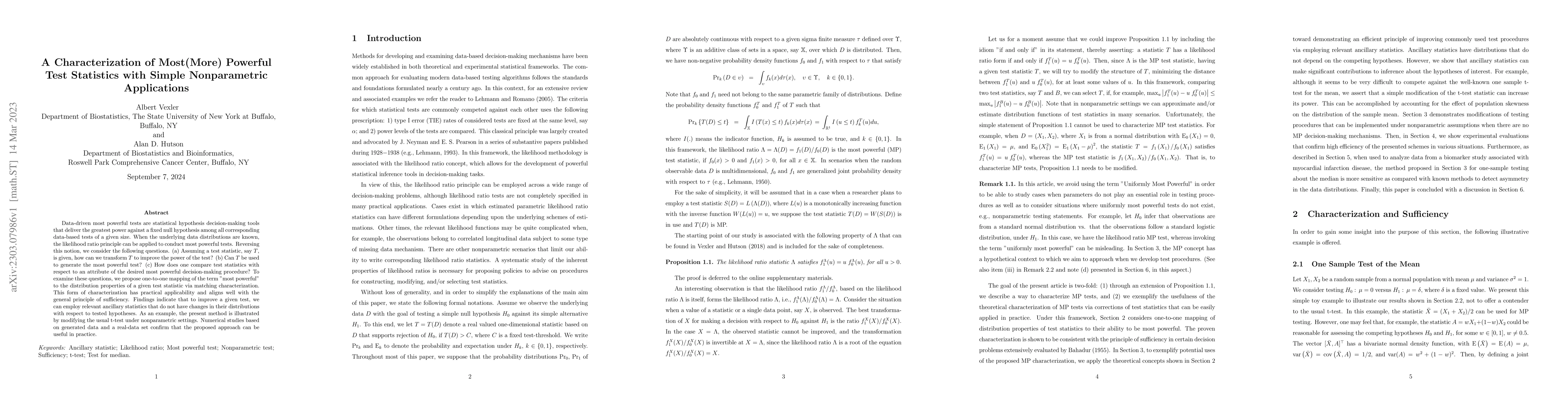 Data-driven most powerful tests are statistical hypothesis decision-making tools that deliver the greatest power against a fixed null hypothesis among all corresponding data-based tests of a given size. When the underlying data distributions are known, the likelihood ratio principle can be applied to conduct most powerful tests. Reversing this notion, we consider the following questions. (a) Assuming a test statistic, say T, is given, how can we transform T to improve the power of the test? (b) Can T be used to generate the most powerful test? (c) How does one compare test statistics with respect to an attribute of the desired most powerful decision-making procedure? To examine these questions, we propose one-to-one mapping of the term 'Most Powerful' to the distribution properties of a given test statistic via matching characterization. This form of characterization has practical applicability and aligns well with the general principle of sufficiency. Findings indicate that to improve a given test, we can employ relevant ancillary statistics that do not have changes in their distributions with respect to tested hypotheses. As an example, the present method is illustrated by modifying the usual t-test under nonparametric settings. Numerical studies based on generated data and a real-data set confirm that the proposed approach can be useful in practice.