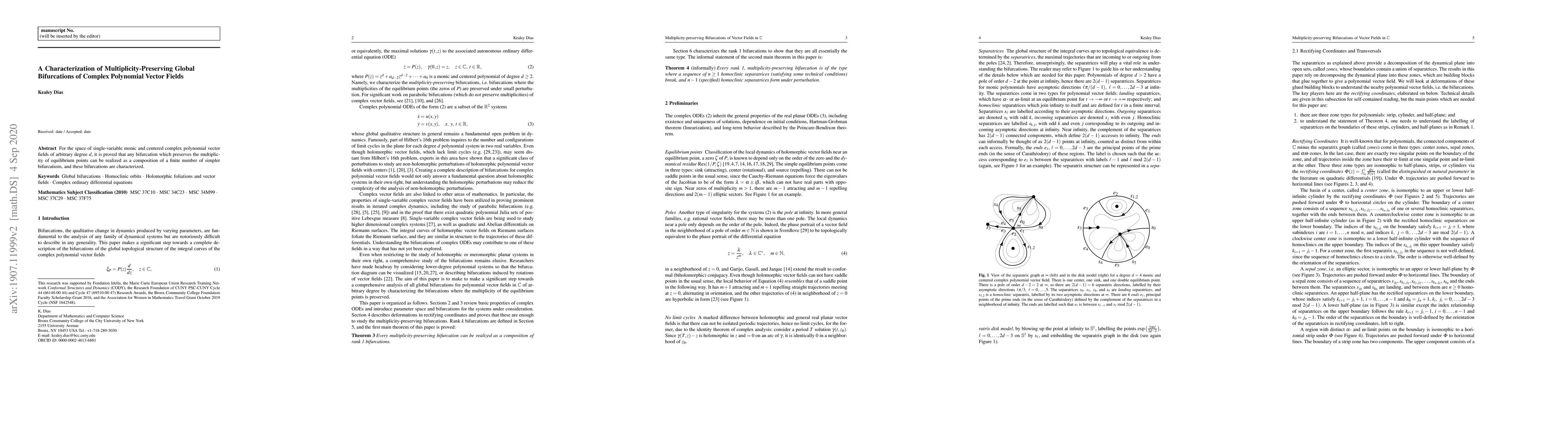 This paper characterizes multiplicity-preserving global bifurcations in complex polynomial vector fields, proving that such bifurcations can be decomposed into a finite composition of simpler bifurcations. The study focuses on single-variable, monic, and centered polynomials of arbitrary degree.