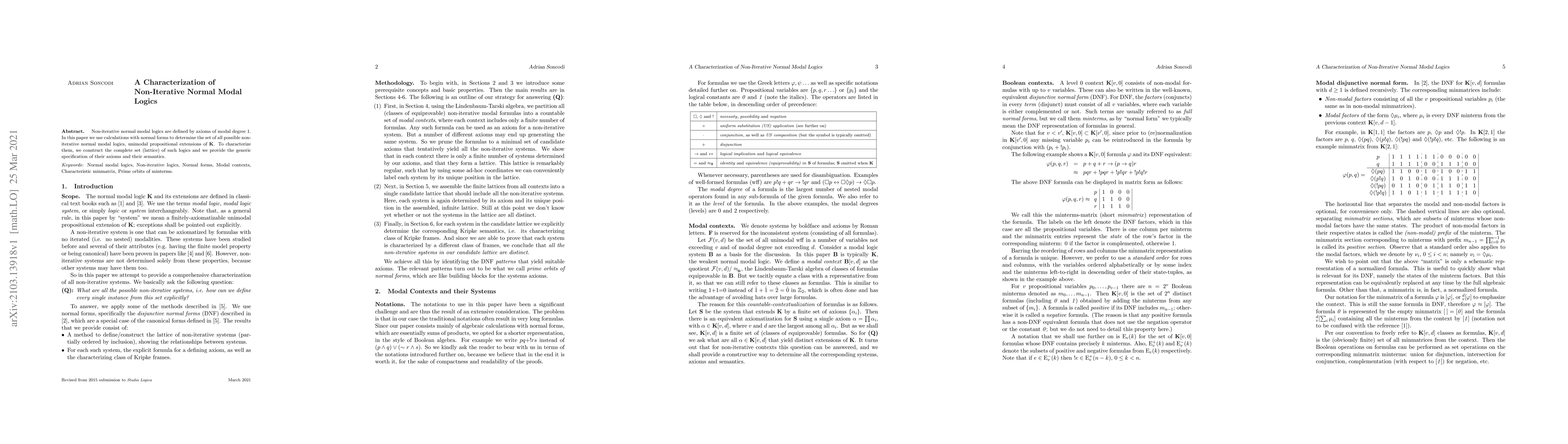 This paper characterizes non-iterative normal modal logics by defining them through first-degree modal axioms and constructing a complete lattice of unimodal propositional extensions of K, detailing their axiomatic specifications and semantics.