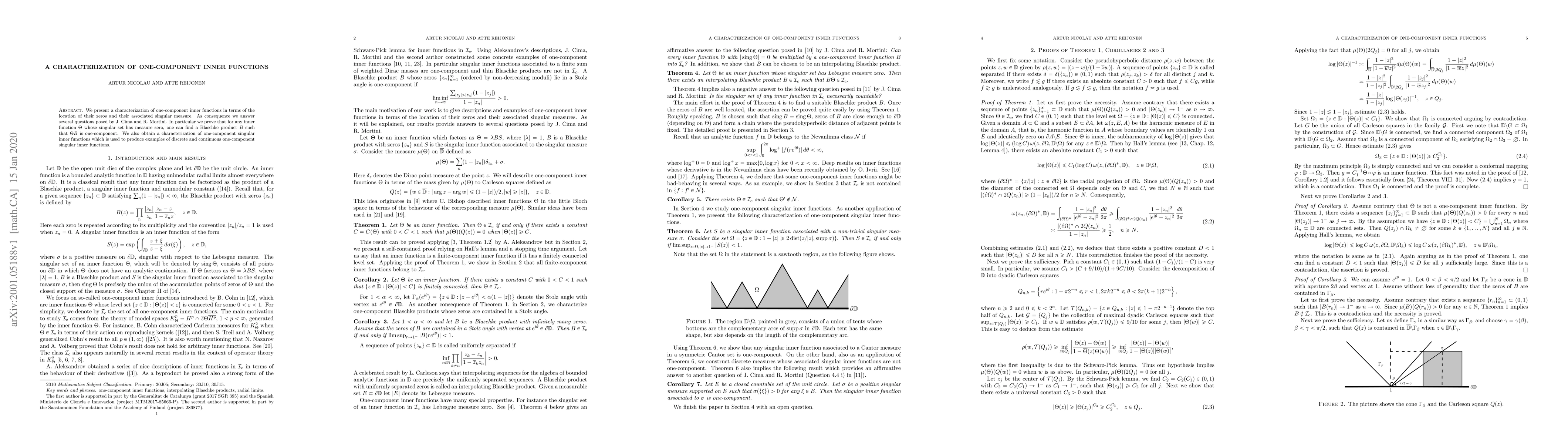 This paper characterizes one-component inner functions by linking their zero locations and singular measures, proving that inner functions with zero-measure singular sets can be transformed into one-component via a Blaschke product. It also provides examples of discrete and continuous one-component singular inner functions.