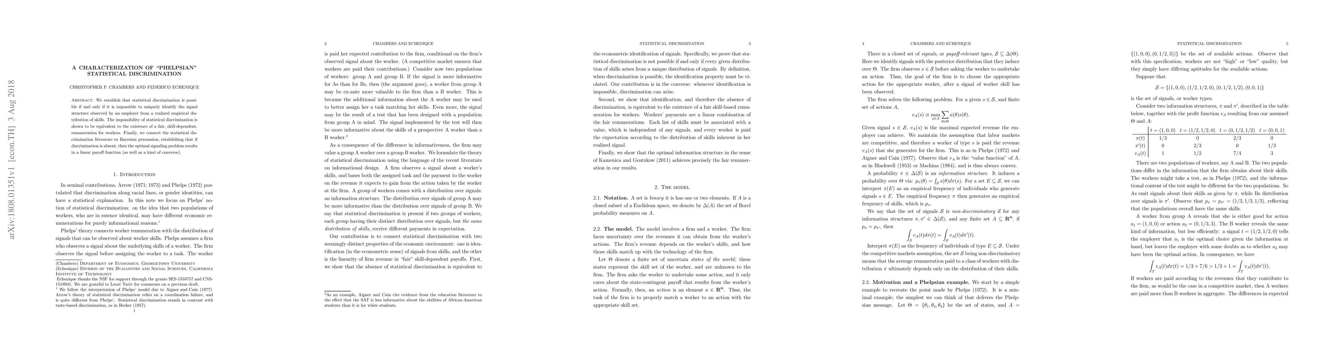 This paper characterizes "Phelpsian" statistical discrimination, proving it occurs when the signal structure cannot be uniquely identified from empirical skill distributions, and is absent when fair, skill-based remuneration exists. It links this to Bayesian persuasion, showing that no discrimination leads to a linear payoff function.