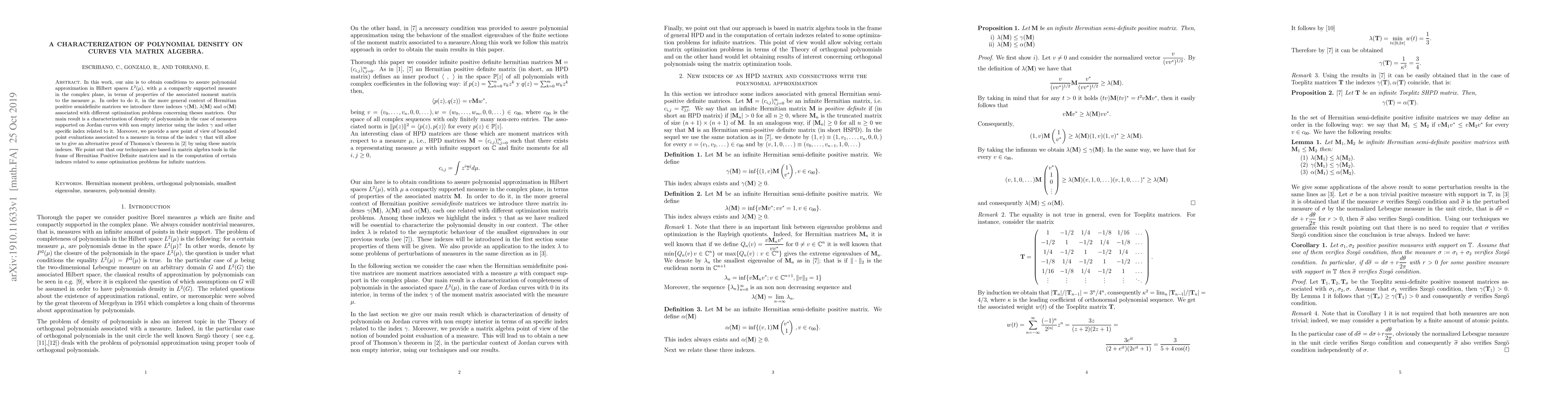 In this work, our aim is to obtain conditions to assure polynomial approximation in Hilbert spaces $L^{2}(\mu)$, with $\mu$ a compactly supported measure in the complex plane, in terms of properties of the associated moment matrix to the measure $\mu$. In order to do it, in the more general context of Hermitian positive semidefinite matrices we introduce three indexes $\gamma(\mathbf{M})$, $\lambda(\mathbf{M})$ and $\alpha(\mathbf{M})$ associated with different optimization problems concerning these matrices. Our main result is a characterization of density of polynomials in the case of measures supported on Jordan curves with non empty interior using the index $\gamma$ and other specific index related to it. Moreover, we provide a new point of view of bounded point evaluations associated to a measure in terms of the index $\gamma$ that will allow us to give an alternative proof of Thomson's theorem in \cite{Brennan} by using these matrix indexes. We point out that our techniques are based in matrix algebra tools in the frame of Hermitian Positive Definite matrices and in the computation of certain indexes related to some optimization problems for infinite matrices.