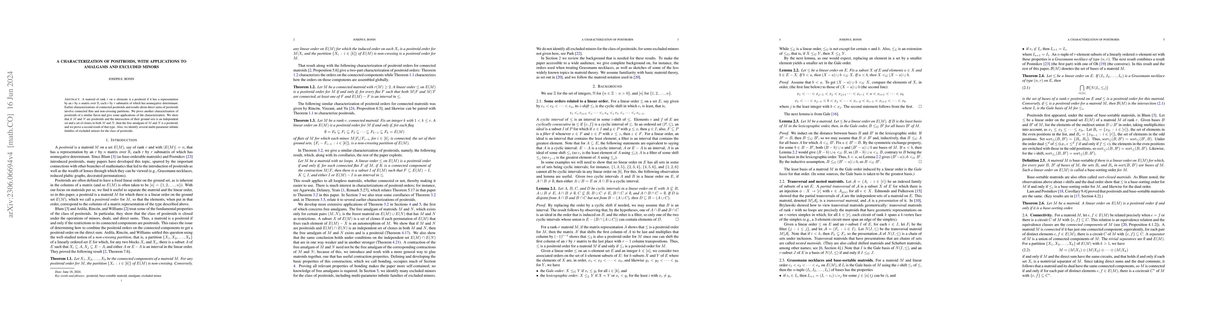 This paper presents a new characterization of positroids, matroids representable by matrices with nonnegative determinants in all submatrices. It explores applications in amalgams and identifies infinite families of excluded minors for positroids.