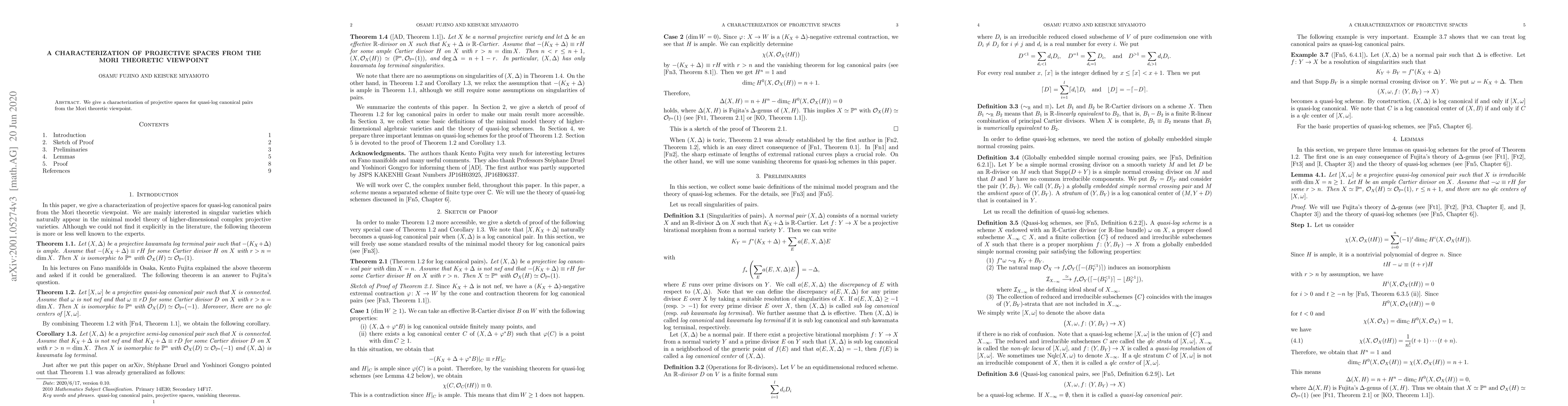 Summary: This paper characterizes projective spaces within the framework of quasi-log canonical pairs using Mori theory. It provides a detailed analysis from a geometric and algebraic perspective, focusing on the properties and implications of these characterizations.