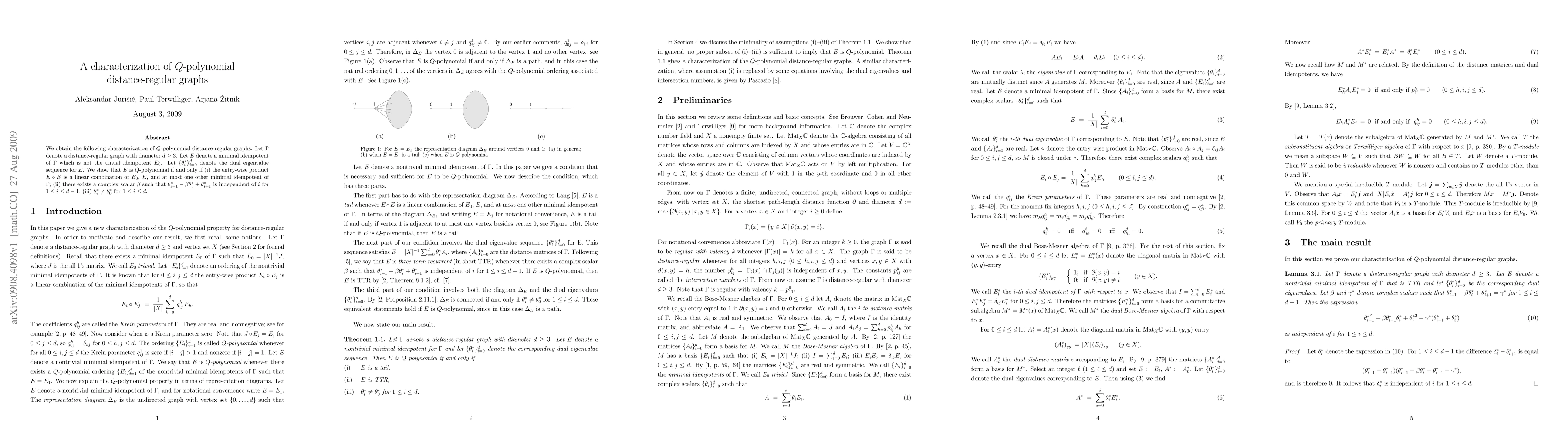 We obtain the following characterization of $Q$-polynomial distance-regular graphs. Let $\G$ denote a distance-regular graph with diameter $d\ge 3$. Let $E$ denote a minimal idempotent of $\G$ which is not the trivial idempotent $E_0$. Let $\{\theta_i^*\}_{i=0}^d$ denote the dual eigenvalue sequence for $E$. We show that $E$ is $Q$-polynomial if and only if (i) the entry-wise product $E \circ E$ is a linear combination of $E_0$, $E$, and at most one other minimal idempotent of $\G$; (ii) there exists a complex scalar $\beta$ such that $\theta^*_{i-1}-\beta \theta^*_i + \theta^*_{i+1}$ is independent of $i$ for $1 \le i \le d-1$; (iii) $\theta^*_i \ne \theta^*_0$ for $1 \le i \le d$.