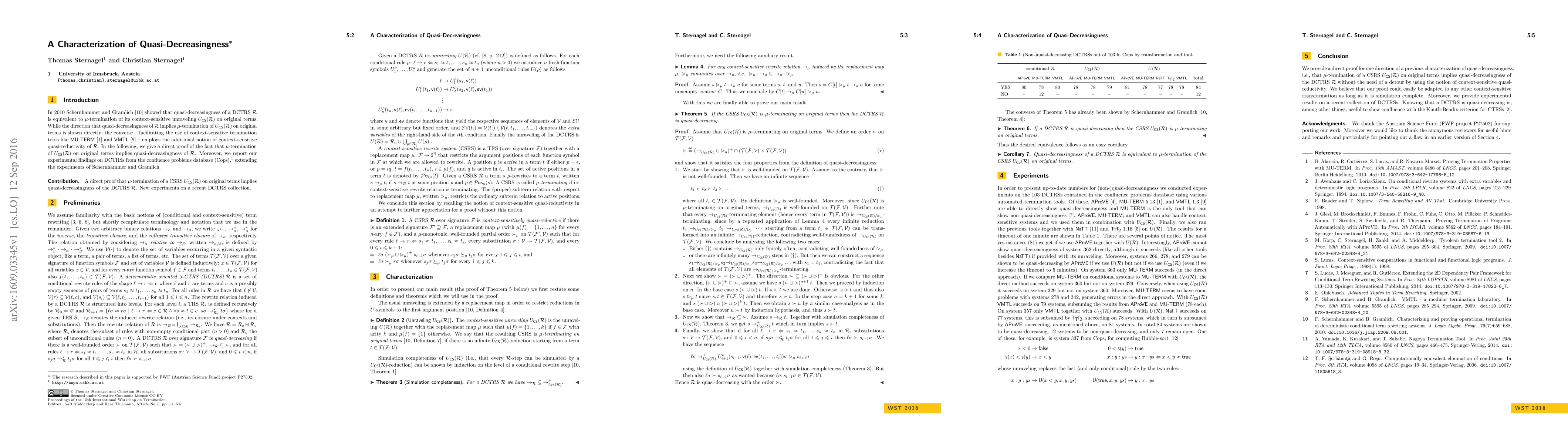 In 2010 Schernhammer and Gramlich showed that quasi-decreasingness of a DCTRS R is equivalent to \mu-termination of its context-sensitive unraveling Ucs(R) on original terms. While the direction that quasi-decreasingness of R implies \mu-termination of Ucs(R) on original terms is shown directly; the converse - facilitating the use of context-sensitive termination tools like MU-TERM and VMTL - employs the additional notion of context-sensitive quasi-reductivity of R. In the following, we give a direct proof of the fact that \mu-termination of Ucs(R) on original terms implies quasi-decreasingness of R. Moreover, we report our experimental findings on DCTRSs from the confluence problems database (Cops), extending the experiments of Schernhammer and Gramlich.