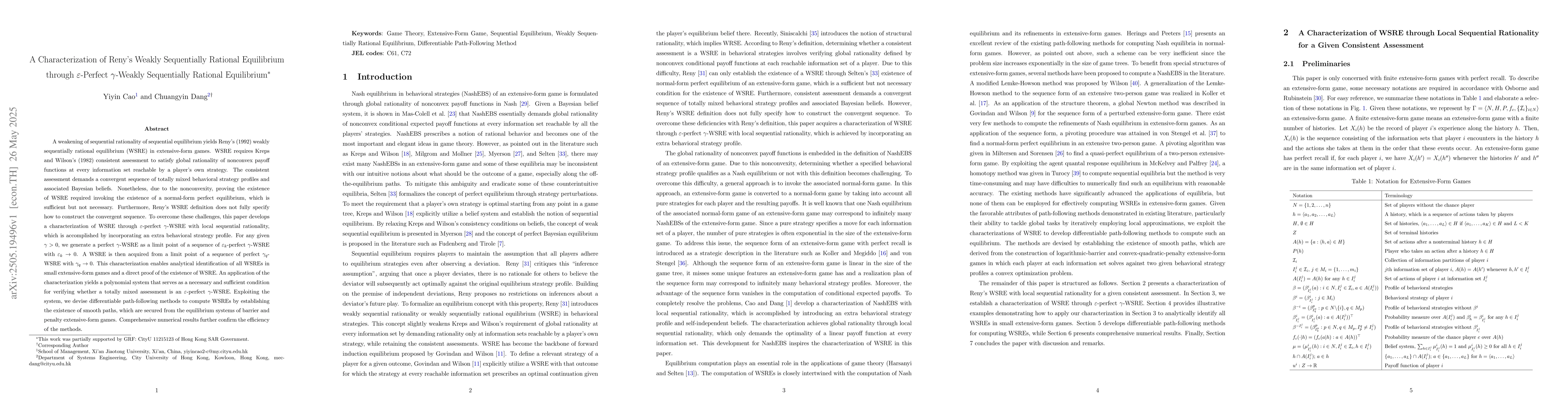 The paper develops a characterization of Reny's Weakly Sequentially Rational Equilibrium (WSRE) using $\varepsilon$-perfect $\gamma$-WSRE with local sequential rationality, overcoming challenges in proving WSRE existence by constructing a convergent sequence of strategy profiles and beliefs.