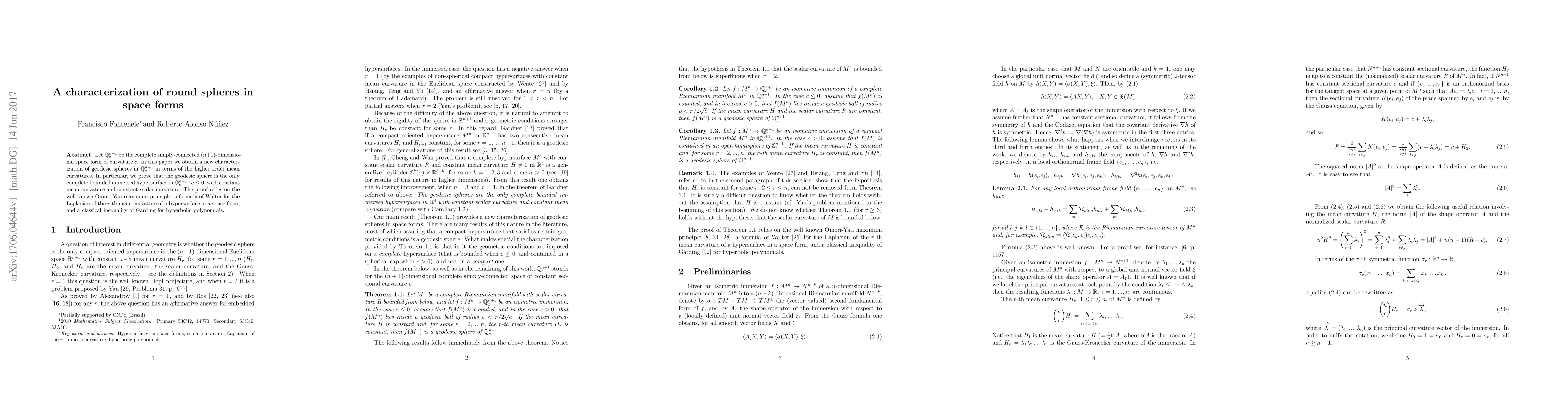 Let $\mathbb Q^{n+1}_c$ be the complete simply-connected $(n+1)$-dimensional space form of curvature $c$. In this paper we obtain a new characterization of geodesic spheres in $\mathbb Q^{n+1}_c$ in terms of the higher order mean curvatures. In particular, we prove that the geodesic sphere is the only complete bounded immersed hypersurface in $\mathbb Q^{n+1}_c,\;c\leq 0,$ with constant mean curvature and constant scalar curvature. The proof relies on the well known Omori-Yau maximum principle, a formula of Walter for the Laplacian of the $r$-th mean curvature of a hypersurface in a space form, and a classical inequality of G\aa rding for hyperbolic polynomials.