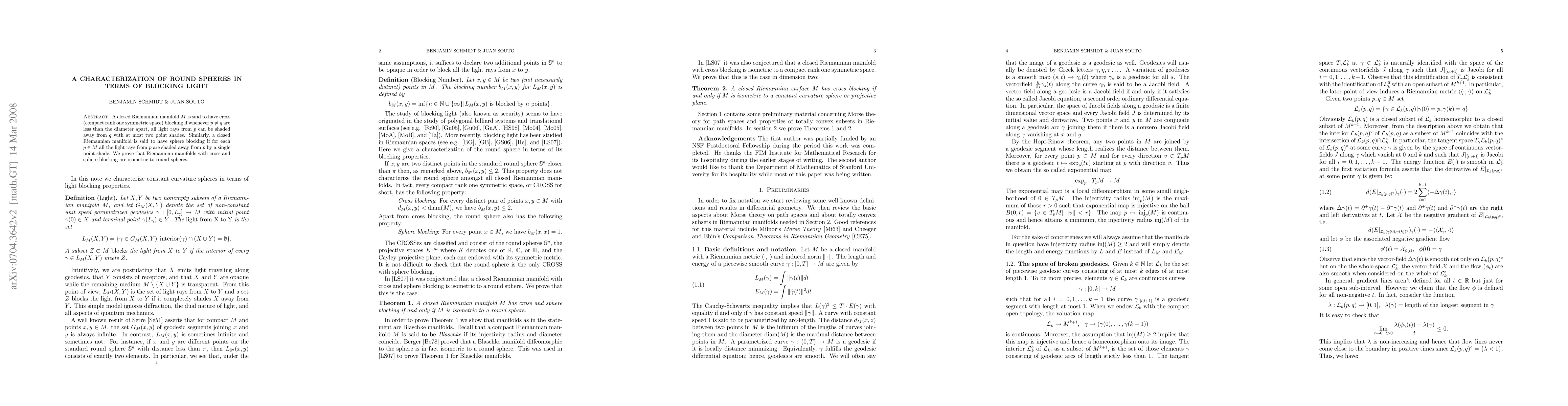 Summary: This paper demonstrates that closed Riemannian manifolds exhibiting both cross blocking and sphere blocking are isometric to round spheres. The study characterizes round spheres based on specific shading conditions of light rays.