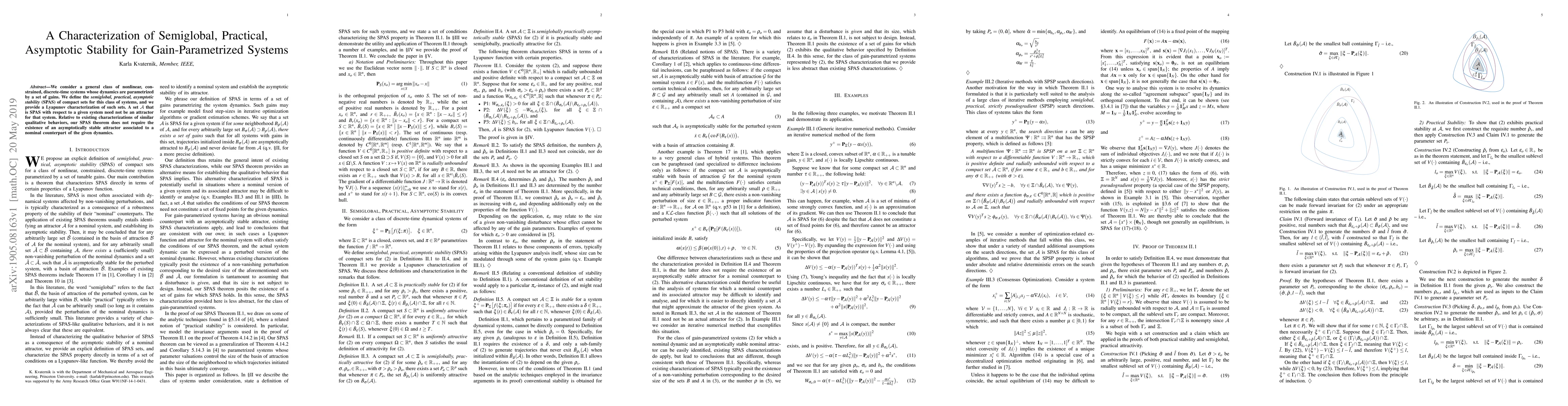 We consider a general class of nonlinear, constrained, discrete-time systems whose dynamics are parametrized by a set of gains. We define the semiglobal, practical, asymptotic stability (SPAS) of compact sets for this class of systems, and we provide a Lyapunov characterization of such sets. A set A that is SPAS with respect to a given system need not be an attractor for that system. Relative to existing characterizations of similar qualitative behaviors, our SPAS theorem does not require the existence of an asymptotically stable attractor associated to a nominal counterpart of the given dynamics.
