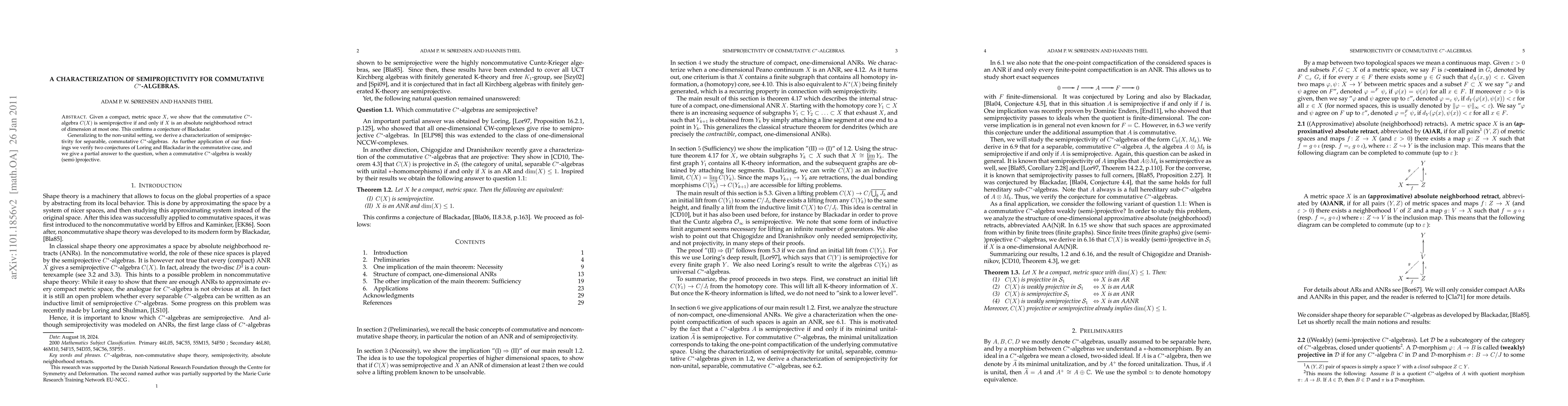 Given a compact, metric space X, we show that the commutative C*-algebra C(X) is semiprojective if and only if X is an absolute neighborhood retract of dimension at most one. This confirms a conjecture of Blackadar. Generalizing to the non-unital setting, we derive a characterization of semiprojectivity for separable, commutative C*-algebras. As further application of our findings we verify two conjectures of Loring and Blackadar in the commutative case, and we give a partial answer to the question, when a commutative C*-algebra is weakly (semi-)projective.