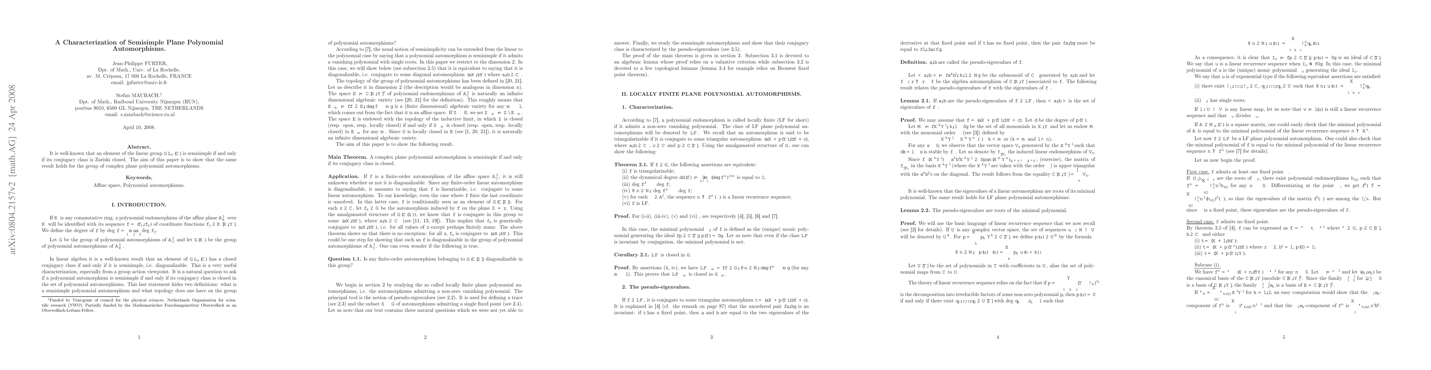 It is well-known that an element of the linear group ${\rm GL}_n(\C)$ is semisimple if and only if its conjugacy class is Zariski closed. The aim of this paper is to show that the same result holds for the group of complex plane polynomial automorphisms.