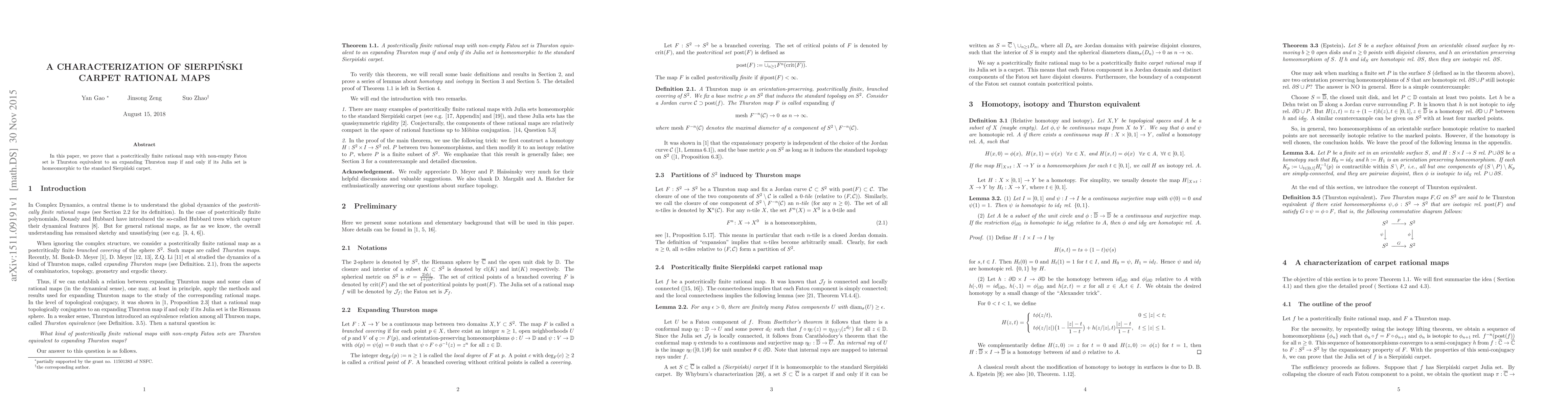 Summary: The paper establishes that a postcritically finite rational map with a non-empty Fatou set is Thurston equivalent to an expanding Thurston map if its Julia set is homeomorphic to the Sierpinski carpet. This characterizes rational maps in relation to their Julia sets and Thurston equivalence.
