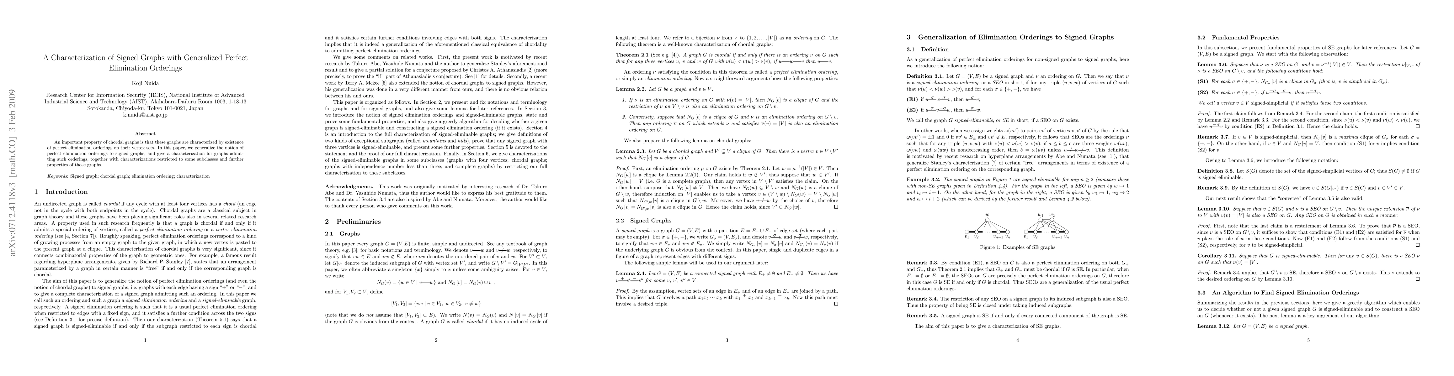 This paper generalizes the concept of perfect elimination orderings from chordal graphs to signed graphs, providing a characterization for such graphs and exploring properties and subclasses within this new framework.