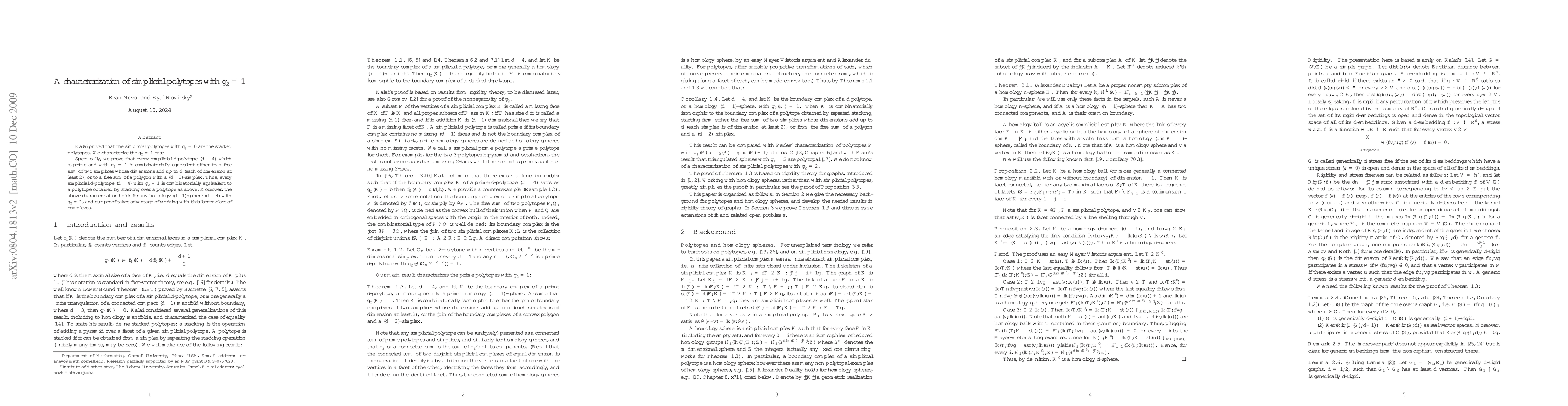 Kalai proved that the simplicial polytopes with g_2=0 are the stacked polytopes. We characterize the g_2=1 case. Specifically, we prove that every simplicial d-polytope (d>=4) which is prime and with g_2=1 is combinatorially equivalent either to a free sum of two simplices whose dimensions add up to d (each of dimension at least 2), or to a free sum of a polygon with a (d-2)-simplex. Thus, every simplicial d-polytope (d>=4) with g_2=1 is combinatorially equivalent to a polytope obtained by stacking over a polytope as above. Moreover, the above characterization holds for any homology (d-1)-sphere (d>=4) with g_2=1, and our proof takes advantage of working with this larger class of complexes.
