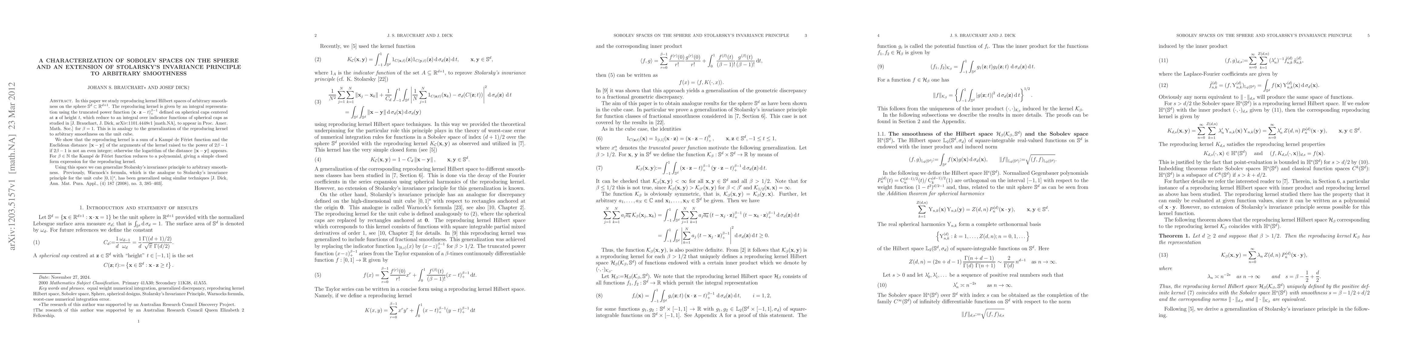 This paper characterizes Sobolev spaces on the sphere $\mathbb{S}^d$ using a reproducing kernel based on truncated power functions. The authors generalize Stolarsky's invariance principle to arbitrary smoothness on the sphere, analogous to previous work on the unit cube.
