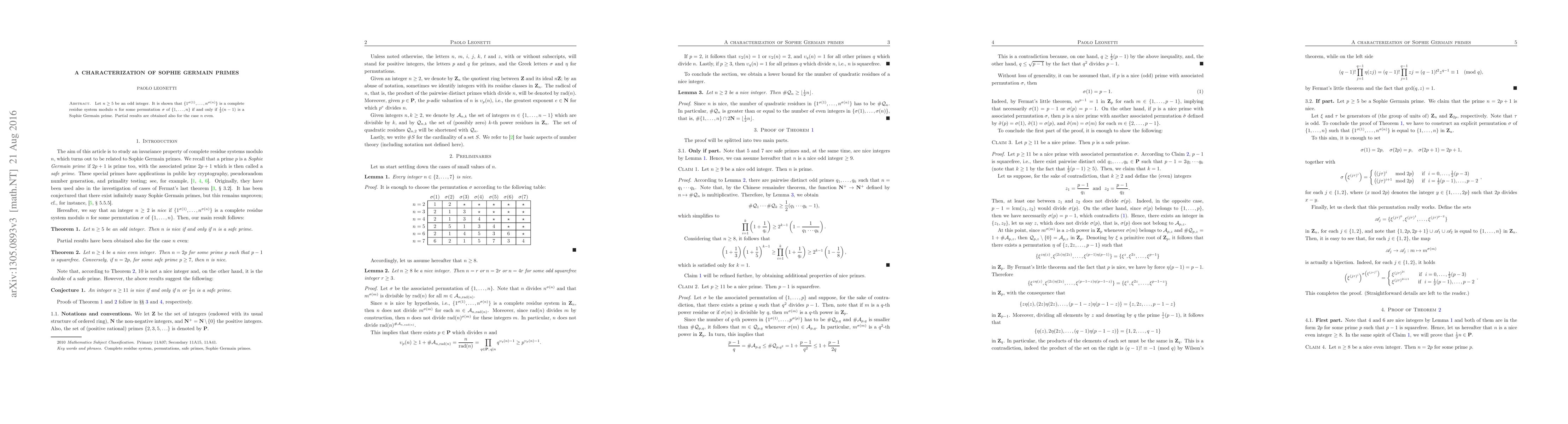 Let $n\ge 5$ be an odd integer. It is shown that $\{1^{\sigma(1)},\ldots,n^{\sigma(n)}\}$ is a complete residue system modulo $n$ for some permutation $\sigma$ of $\{1,\ldots,n\}$ if and only if $\frac{1}{2}(n-1)$ is a Sophie Germain prime. Partial results are obtained also for the case $n$ even.