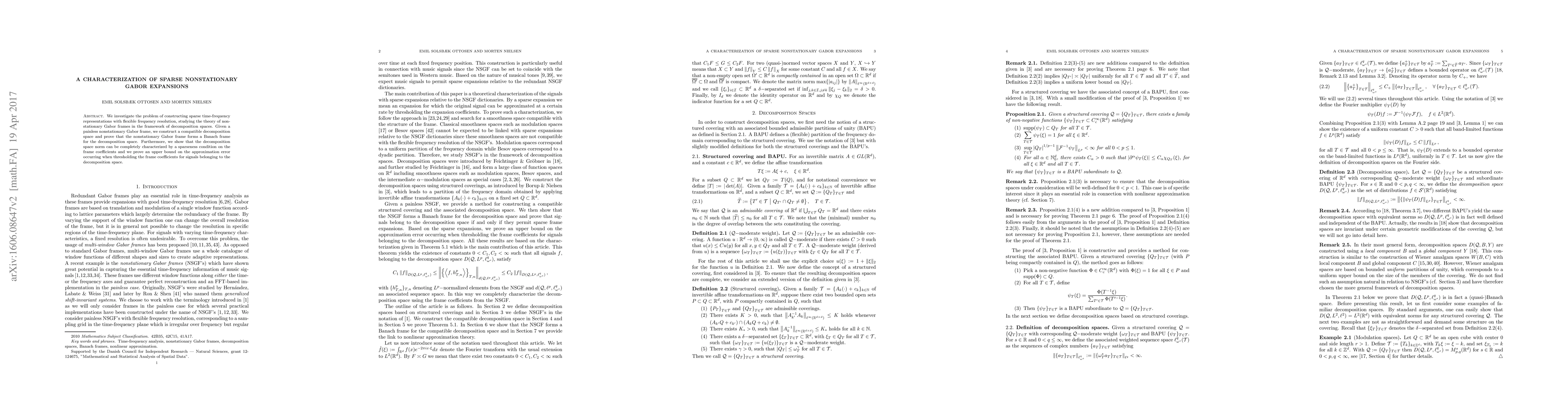 We investigate the problem of constructing sparse time-frequency representations with flexible frequency resolution, studying the theory of nonstationary Gabor frames in the framework of decomposition spaces. Given a painless nonstationary Gabor frame, we construct a compatible decomposition space and prove that the nonstationary Gabor frame forms a Banach frame for the decomposition space. Furthermore, we show that the decomposition space norm can be completely characterized by a sparseness condition on the frame coefficients and we prove an upper bound on the approximation error occurring when thresholding the frame coefficients for signals belonging to the decomposition space.