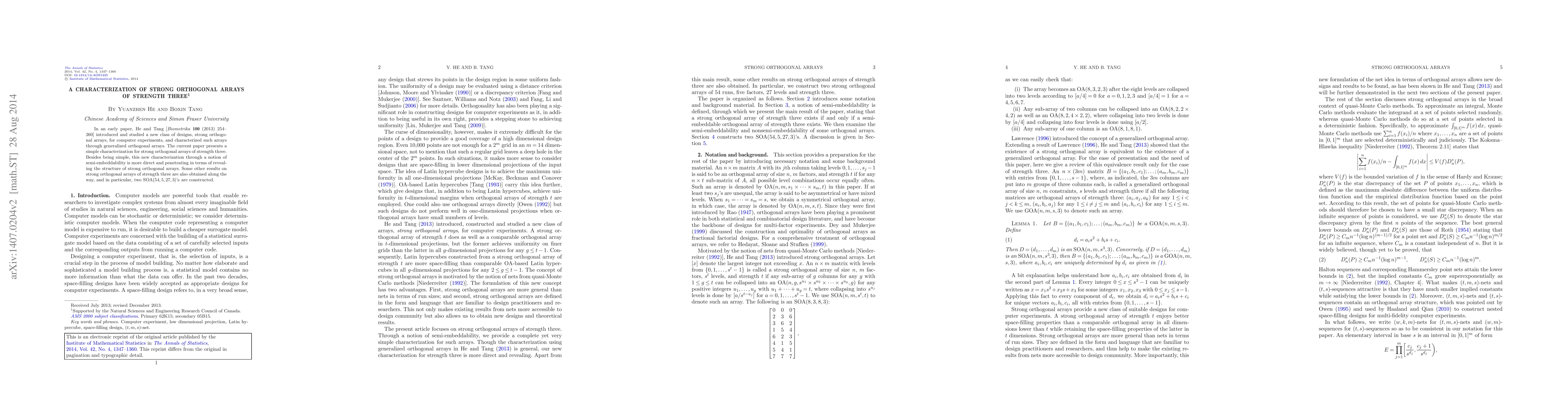 This paper characterizes strong orthogonal arrays of strength three through a notion of semi-embeddability, offering a more direct and insightful understanding of their structure. Additionally, two specific $\operatorname{SOA}(54,5,27,3)$ arrays are constructed.