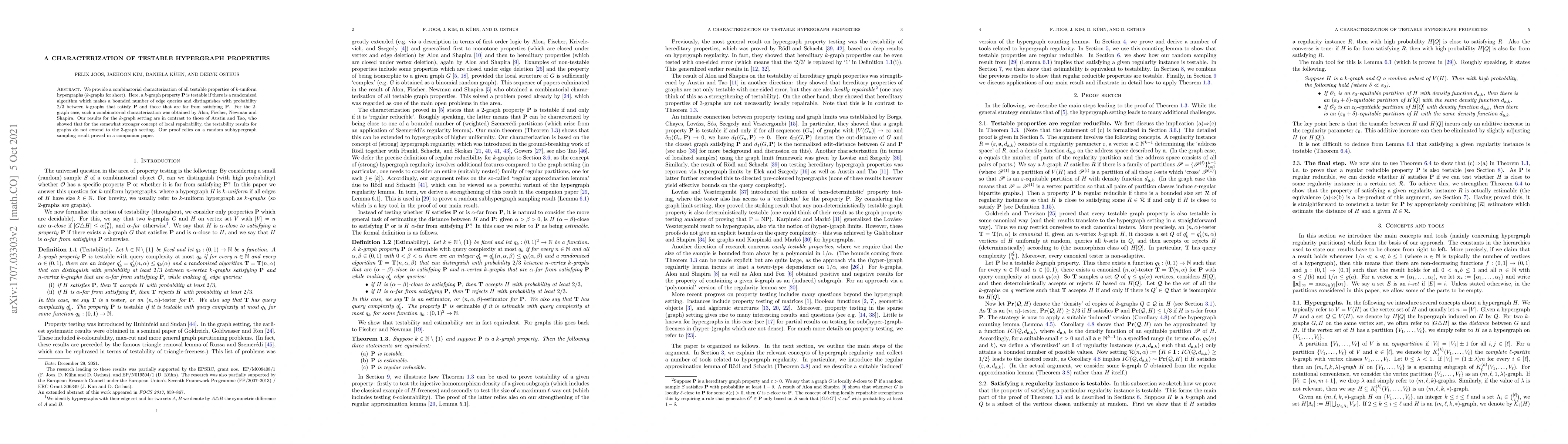 This paper presents a combinatorial characterization of testable properties for k-uniform hypergraphs, extending previous work for 2-graphs. The results contrast with earlier findings on local repairability for 3-graphs, utilizing a random subhypergraph sampling theorem from a companion paper.