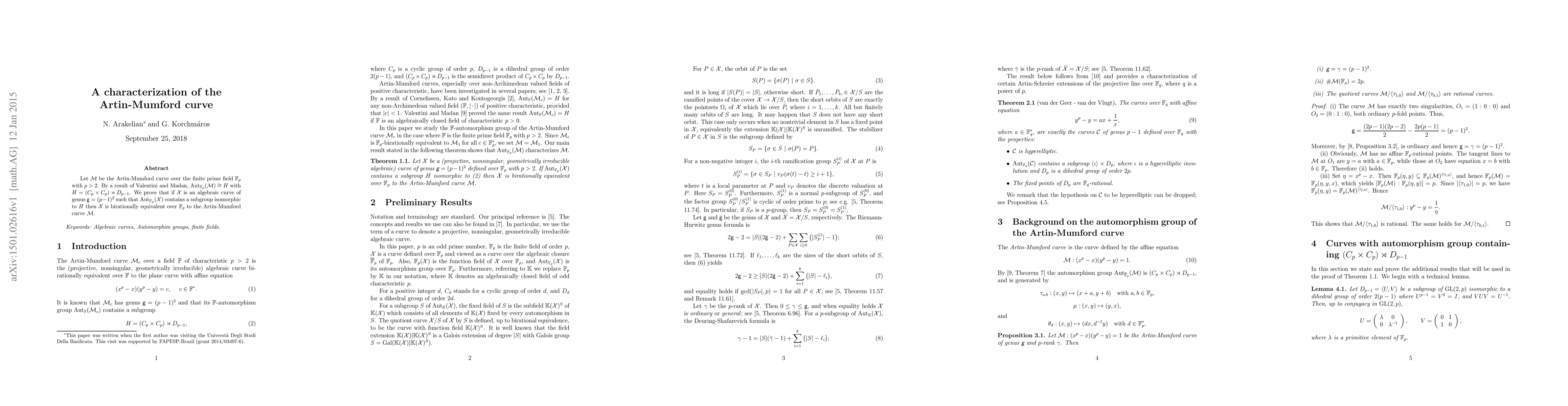 This paper characterizes the Artin-Mumford curve over $\mathbb{F}_p$ ($p>2$) by proving that any algebraic curve of genus $(p-1)^2$ with an automorphism group containing a specific subgroup isomorphic to $H=(C_p\times C_p)\rtimes D_{p-1}$ is birationally equivalent to the Artin-Mumford curve.