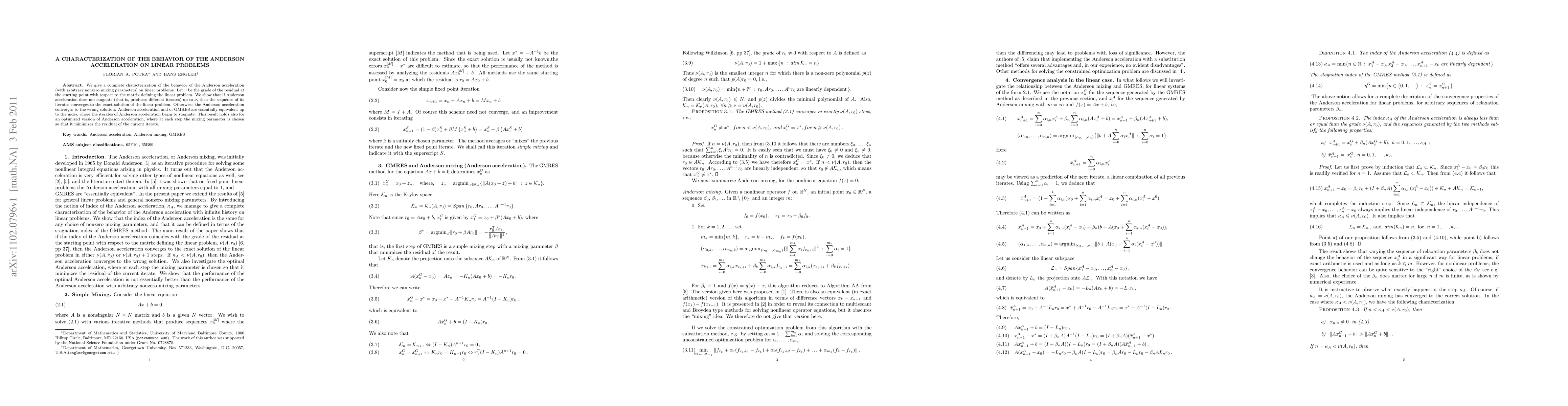 This paper provides a complete characterization of Anderson acceleration on linear problems, showing that it converges to the exact solution if it does not stagnate up to the residual's grade, and otherwise converges to an incorrect solution. The behavior of Anderson acceleration is shown to be essentially equivalent to GMRES up to the point of stagnation.