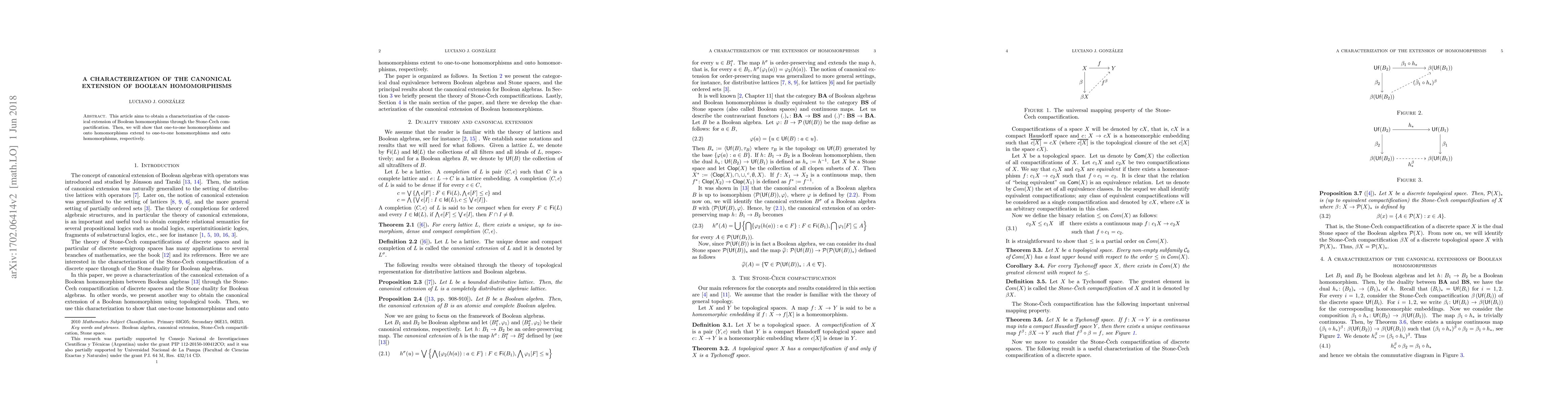 This article aims to obtain a characterization of the canonical extension of Boolean homomorphisms through the Stone-\v{C}ech compactification. Then, we will show that one-to-one homomorphisms and onto homomorphisms extend to one-to-one homomorphisms and onto homomorphisms, respectively.