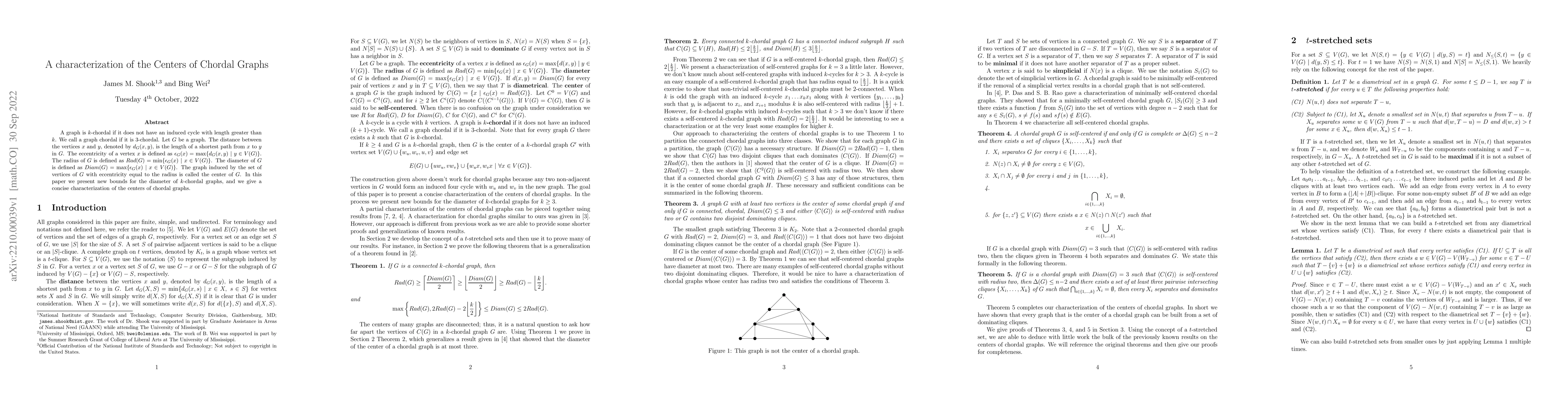 This paper provides new bounds for the diameter of $k$-chordal graphs and offers a detailed characterization of the centers of chordal graphs, focusing on the vertices with eccentricity equal to the radius.