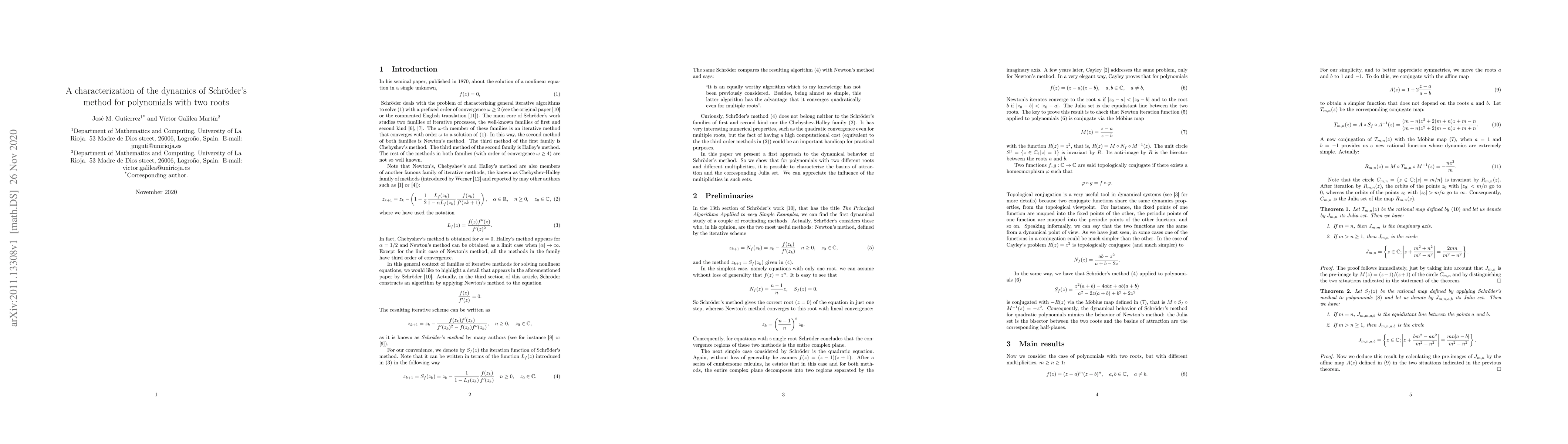 This paper characterizes the dynamical behavior of Schröder's method for solving nonlinear equations, focusing on polynomials with two roots of different multiplicities. It uses topological conjugations to show that the basins of attraction are half-planes or circles, and includes a comparative graphical analysis with Newton's method.