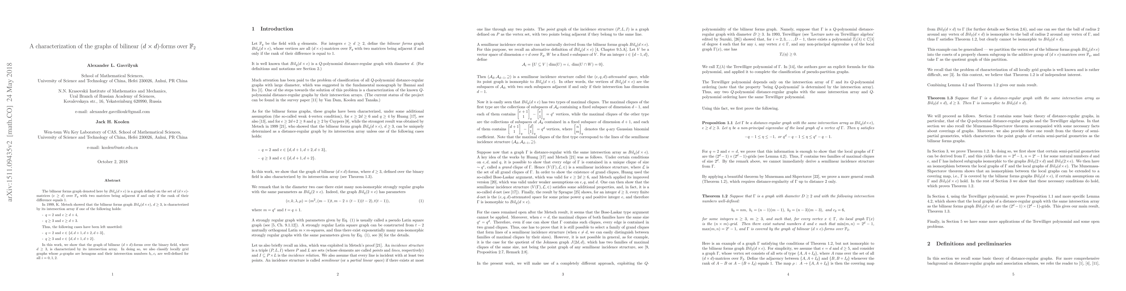 The bilinear forms graph denoted here by $Bil_q(e\times d)$ is a graph defined on the set of $(e\times d)$-matrices ($e\geq d$) over $\mathbb{F}_q$ with two matrices being adjacent if and only if the rank of their difference equals $1$. In 1999, K. Metsch showed that the bilinear forms graph $Bil_q(e\times d)$ is characterized by its intersection array if one of the following holds: (-) $q=2$ and $e\geq d+4$, (-) $q\geq 3$ and $e\geq d+3$. Thus, the following cases have been left unsettled: (-) $q=2$ and $e\in \{d,d+1,d+2,d+3\}$, (-) $q\geq 3$ and $e\in \{d,d+1,d+2\}$. In this work, we show that the graph of bilinear $(d\times d)$-forms over the binary field, where $d\geq 3$, is characterized by its intersection array. In doing so, we also classify locally grid graphs whose $\mu$-graphs are hexagons and the intersection numbers $b_i,c_i$ are well-defined for all $i=0,1,2$.