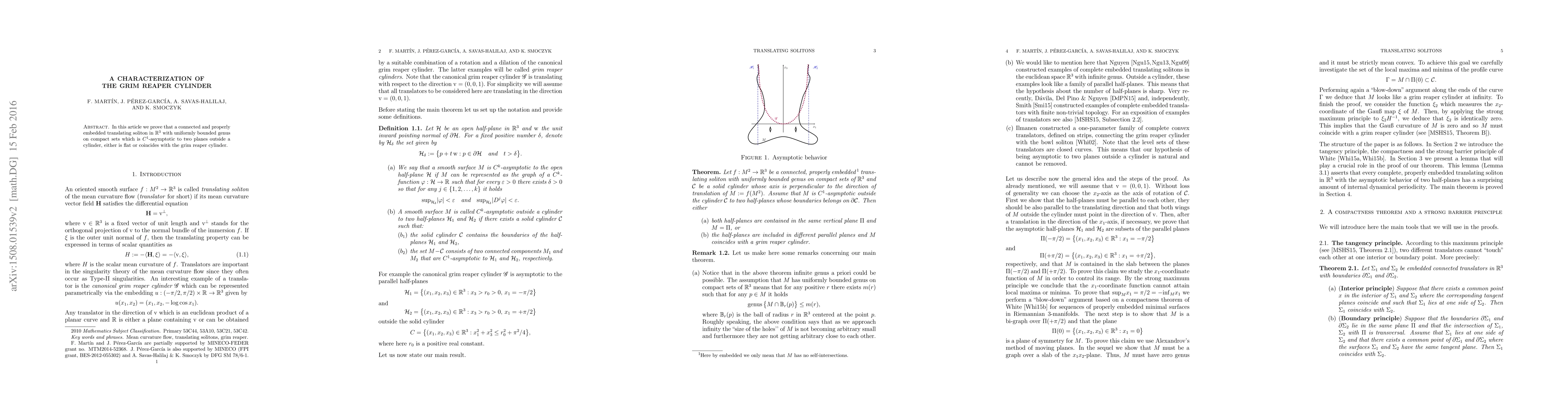 In this article we prove that a connected and properly embedded translating soliton in $\mathbb{R}^3$ with uniformly bounded genus on compact sets which is $C^1$-asymptotic to two planes outside a cylinder, either is flat or coincides with the grim reaper cylinder.