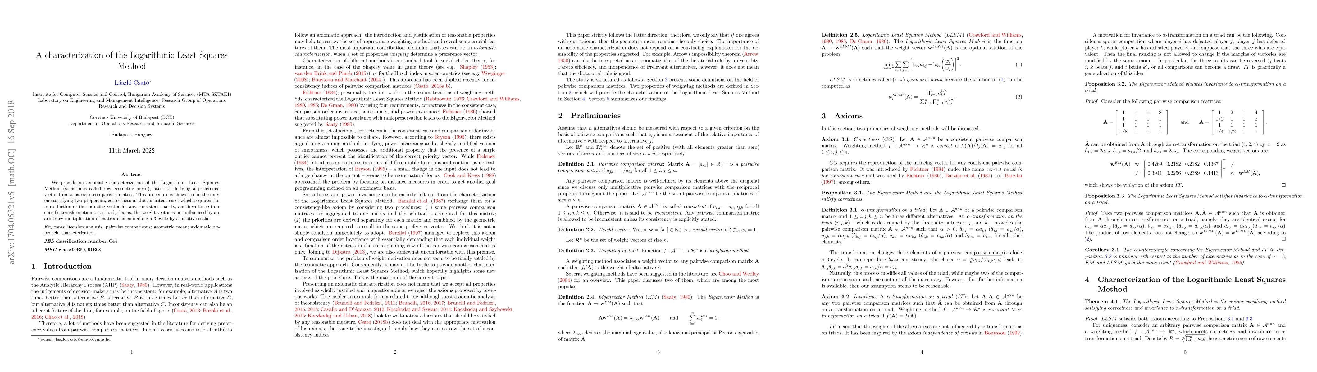 This paper presents an axiomatic characterization of the Logarithmic Least Squares Method, also known as row geometric mean, for generating preference vectors from pairwise comparison matrices. It establishes this method as the sole approach fulfilling correctness in consistent cases and invariance to specific matrix transformations involving triads.
