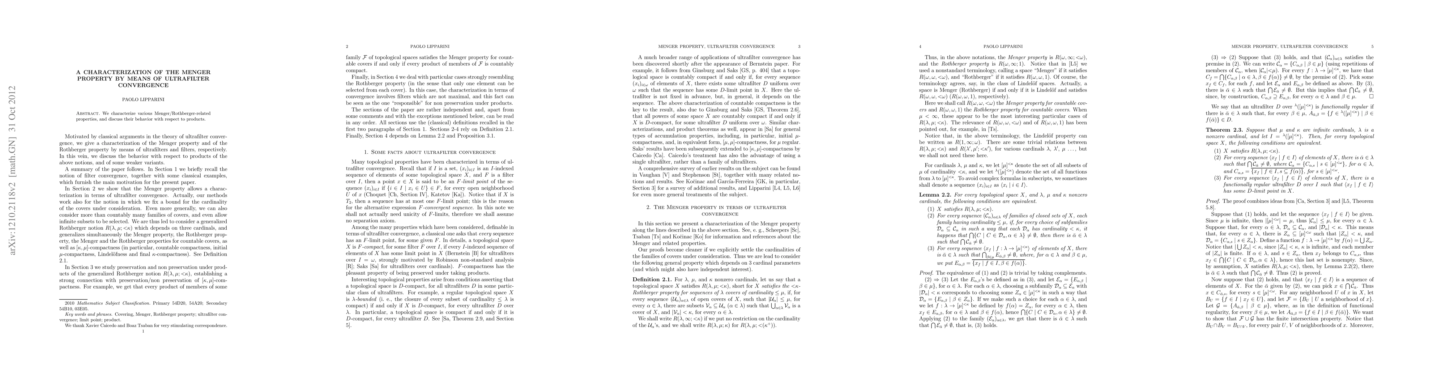 Summary: This paper characterizes Menger and Rothberger properties through the lens of ultrafilter convergence, examining how these properties behave under product spaces.