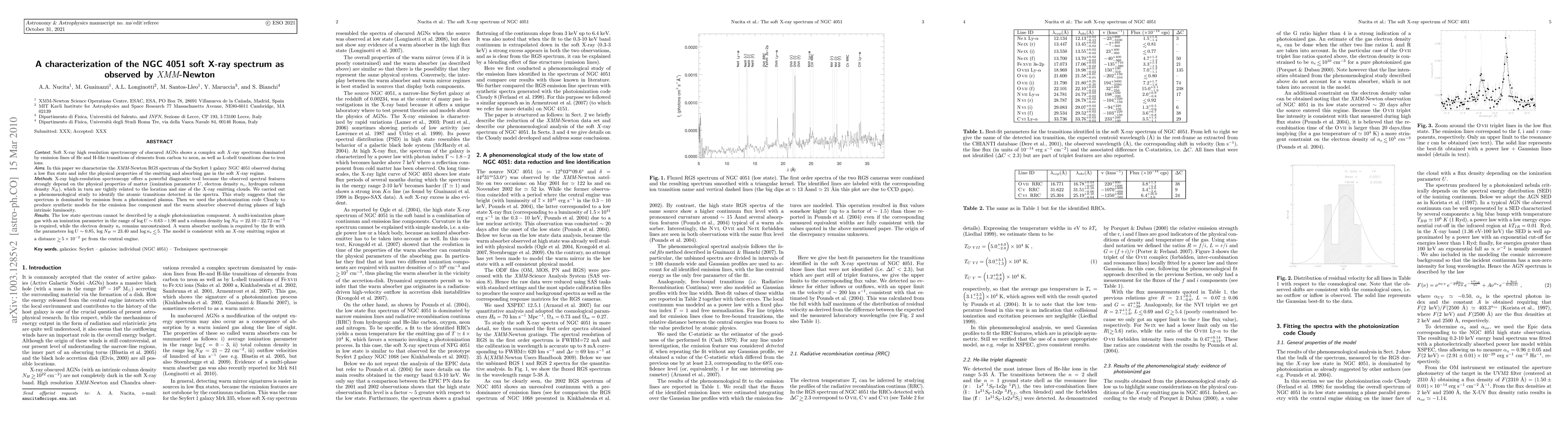 Soft X-rays high resolution spectroscopy of obscured AGNs shows the existence of a complex soft $X$-ray spectrum dominated by emission lines of He and H-like transitions of elements from Carbon to Neon, as well as L-shell transitions due to iron ions. In this paper we characterize the XMM-Newton RGS spectrum of the Seyfert 1 galaxy NGC 4051 observed during a low flux state and infer the physical properties of the emitting and absorbing gas in the soft X-ray regime. X-ray high-resolution spectroscopy offers a powerful diagnostic tool since the observed spectral features strongly depend on the physical properties of matter (ionization parameter U, electron density n_e, hydrogen column density N_H), which in turn are tightly related to the location and size of the X-ray emitting clouds. We carried out a phenomenological study to identify the atomic transitions detected in the spectra. This study suggests that the spectrum is dominated by emission from a photoionised plasma. Then, we used the photoionization code Cloudy to produce synthetic models for the emission line component and the warm absorber observed during phases of high intrinsic luminosity. The low state spectrum cannot be described by a single photoionization component. A multi-ionization phase gas with ionization parameter in the range log U = 0.63-1.90 and column density log N_H = 22.10-22.72 cm^-2 is required, while the electron density n_e remains unconstrained. A warm absorber medium is required by the fit with parameters log U = 0.85, log N_H = 23.40 and log n_e \ut< 5. The model is consistent with an X-ray emitting regions at a distance > 5 x 10^-2 pc from the central engine.