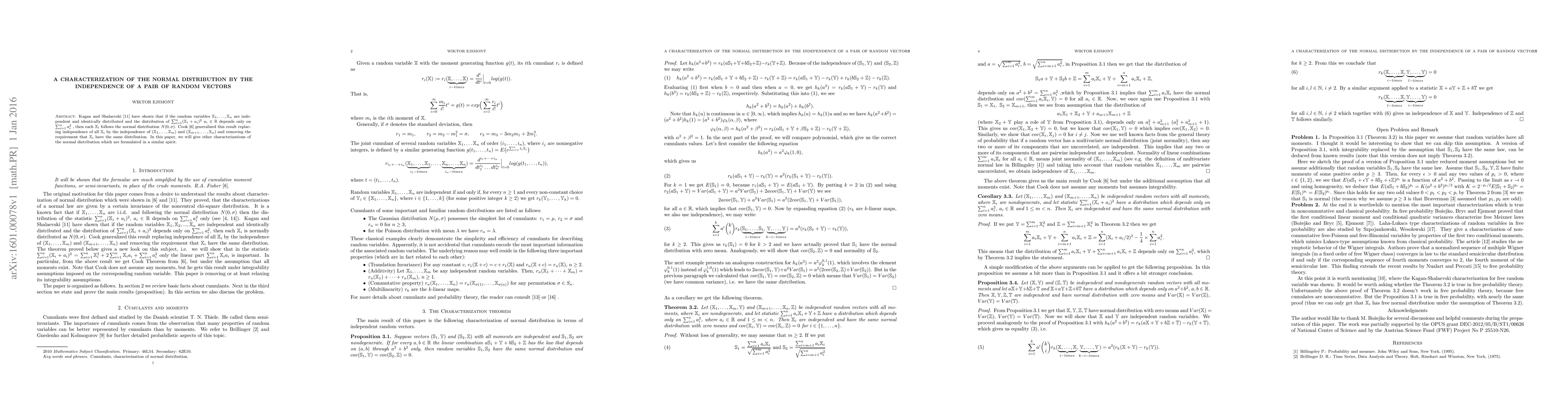 Kagan and Shalaevski 1967 have shown that if the random variables $X_1,\dots,X_n$ are independent and identically distributed and the distribution of $\sum_{i=1}^n(X_i+a_i)^2$ $a_i\in \mathbb{R}$ depends only on $\sum_{i=1}^na_i^2$ , then each $X_i$ follows the normal distribution $N(0, \sigma)$. Cook 1971 generalized this result replacing independence of all $X_i$ by the independence of $(X_1,\dots, X_m) \textrm{ and } (X_{m+1},\dots,X_n )$ and removing the requirement that $X_i$ have the same distribution. In this paper, we will give other characterizations of the normal distribution which are formulated in a similar spirit.