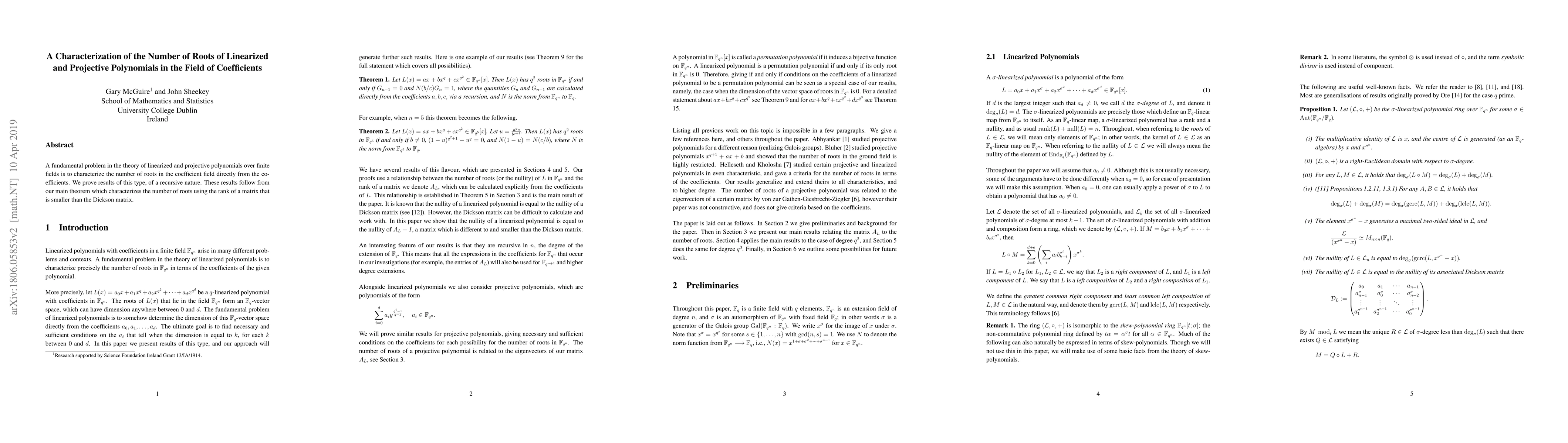 The paper characterizes the number of roots of linearized and projective polynomials over finite fields directly from their coefficients, proving recursive results derived from a main theorem that employs a matrix of smaller rank than the Dickson matrix.