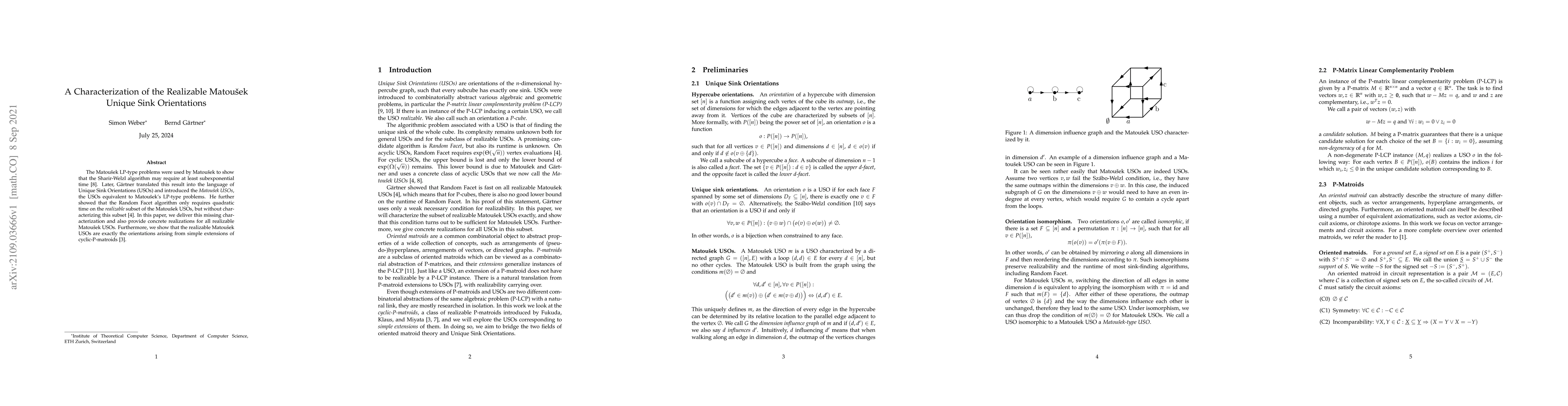 This paper characterizes the realizable Matoušek Unique Sink Orientations (USOs), providing concrete realizations for all realizable instances and demonstrating that these realizable USOs correspond precisely to orientations derived from simple extensions of cyclic-P-matroids.
