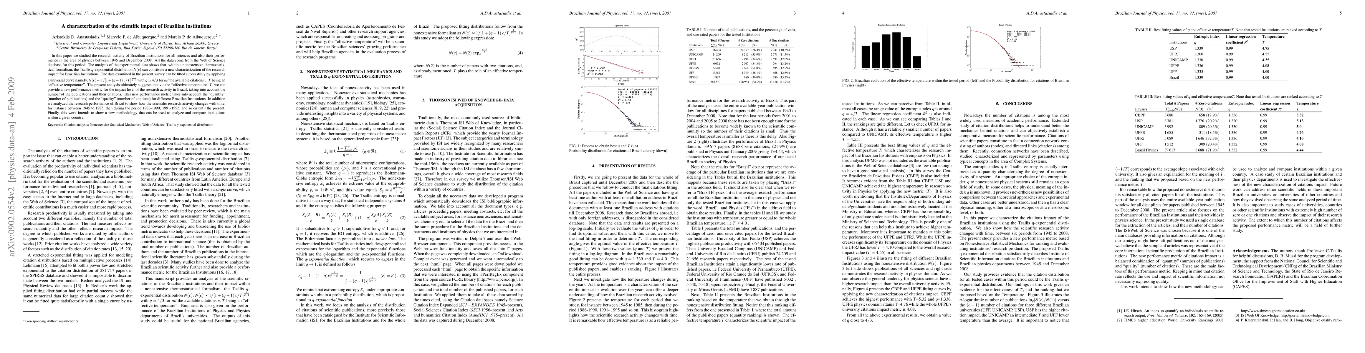This research paper analyzes the scientific impact of Brazilian institutions using a nonextensive thermostatic formalism, fitting citation data to a Tsallis q-exponential distribution. The study reveals a universal curve to measure research performance, combining 'quantity' (publications) and 'quality' (citations). The methodology also traces Brazil's research progression over time, offering a new approach to compare institutions within the country.