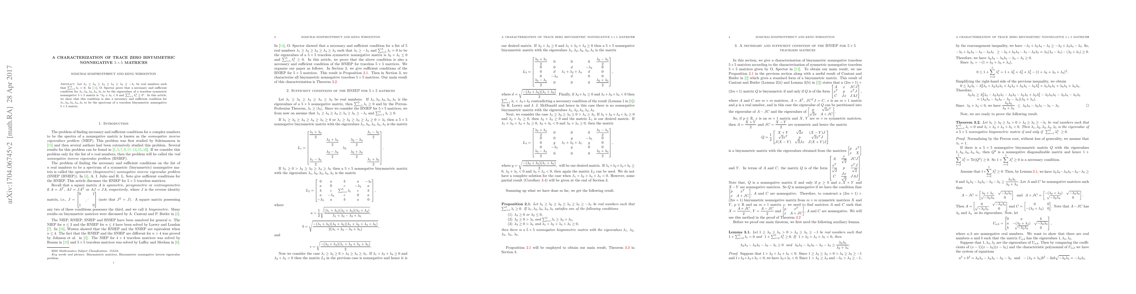 Let $\lambda_1 \geq \lambda_2 \geq \lambda_3 \geq \lambda_4 \geq \lambda_5 \geq -\lambda_1$ be real numbers such that $\sum_{i=1}^5 \lambda_i =0$. In \cite{oren}, O. Spector prove that a necessary and sufficient condition for $\lambda_1, \lambda_2, \lambda_3, \lambda_4, \lambda_5$ to be the eigenvalues of a symmetric nonnegative $5 \times 5$ matrix is "$\lambda_2+\lambda_5<0$ and $\sum_{i=1}^5 \lambda_{i}^{3} \geq 0"$. In this article, we show that this condition is also a necessary and sufficient condition for $\lambda_1, \lambda_2, \lambda_3, \lambda_4, \lambda_5$ to be the spectrum of a traceless bisymmetric nonnegative $5 \times 5$ matrix.