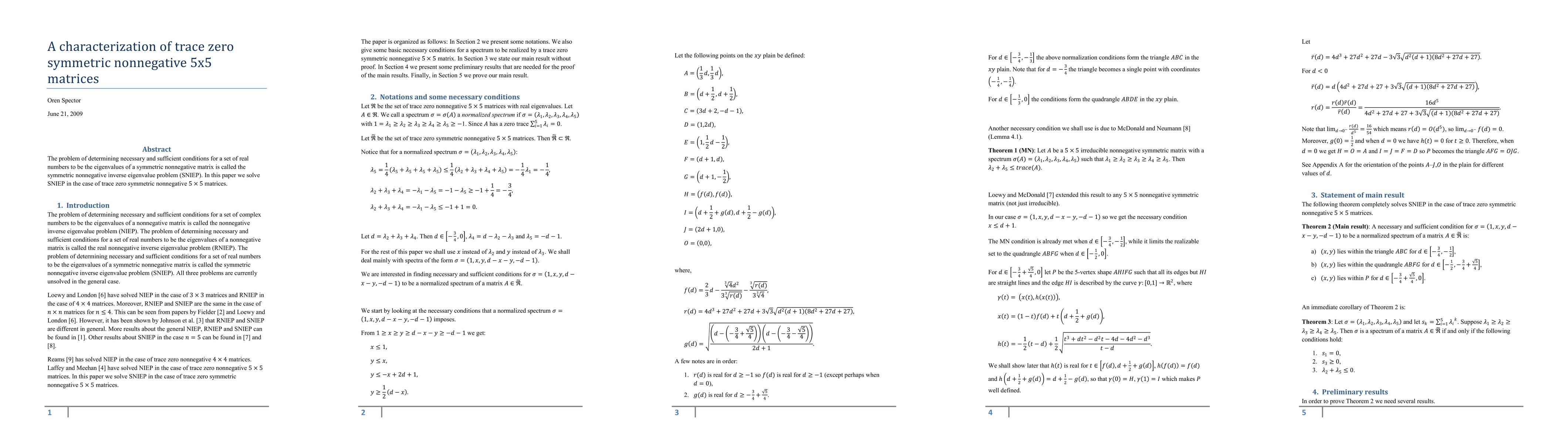 The problem of determining necessary and sufficient conditions for a set of real numbers to be the eigenvalues of a symmetric nonnegative matrix is called the symmetric nonnegative inverse eigenvalue problem (SNIEP). In this paper we solve SNIEP in the case of trace zero symmetric nonnegative 5x5 matrices.