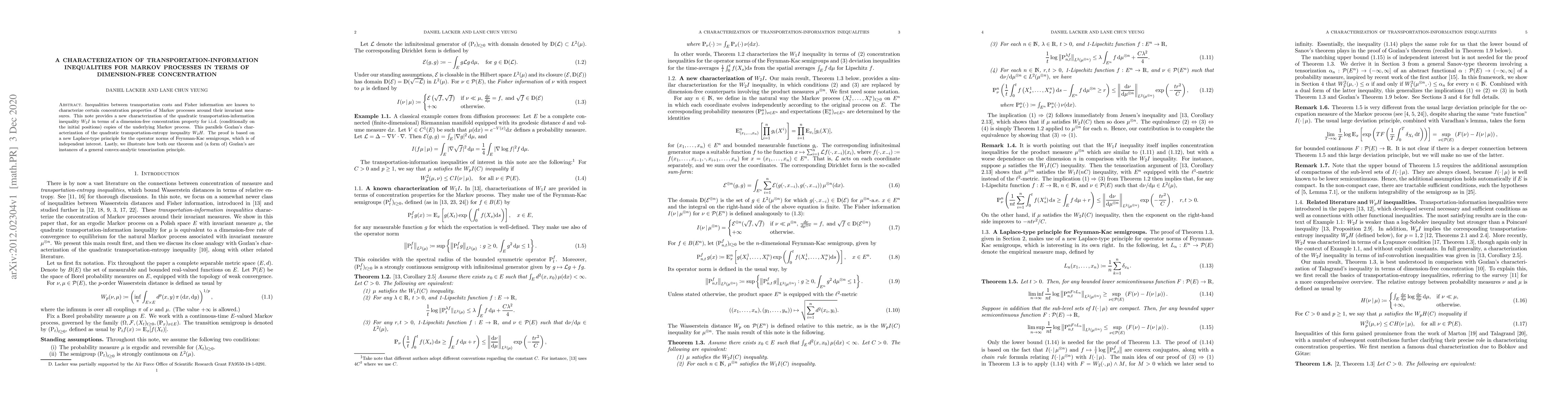 Inequalities between transportation costs and Fisher information are known to characterize certain concentration properties of Markov processes around their invariant measures. This note provides a new characterization of the quadratic transportation-information inequality $W_2I$ in terms of a dimension-free concentration property for i.i.d. (conditionally on the initial positions) copies of the underlying Markov process. This parallels Gozlan's characterization of the quadratic transportation-entropy inequality $W_2H$. The proof is based on a new Laplace-type principle for the operator norms of Feynman-Kac semigroups, which is of independent interest. Lastly, we illustrate how both our theorem and (a form of) Gozlan's are instances of a general convex-analytic tensorization principle.