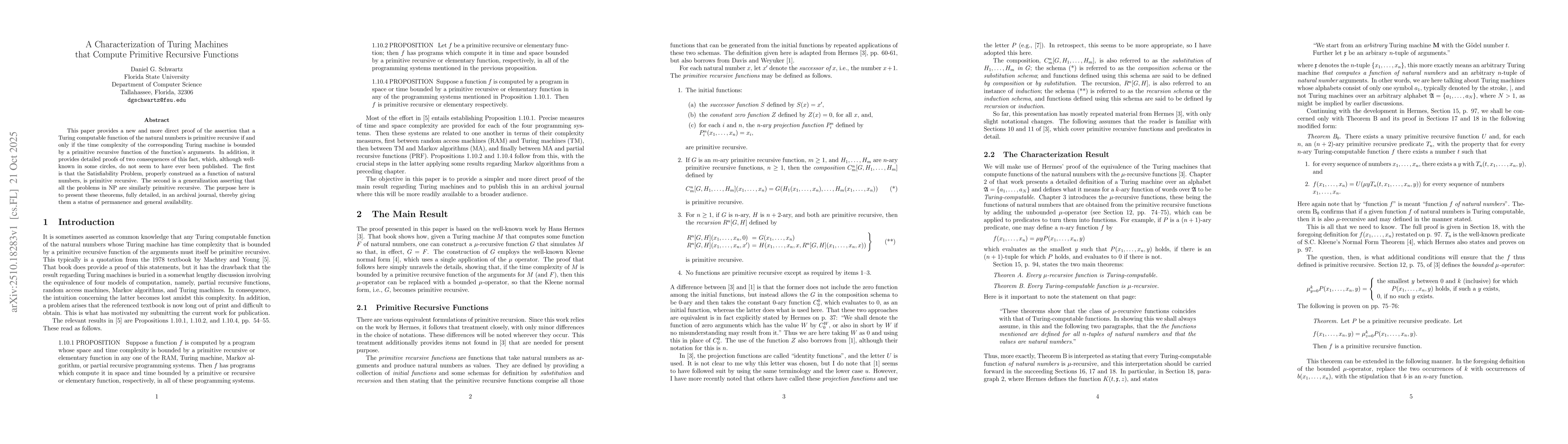 The paper presents a direct proof of the equivalence between Turing computable functions that are primitive recursive and their time complexity bounded by a primitive recursive function. It also provides detailed proofs of two consequences of this fact.