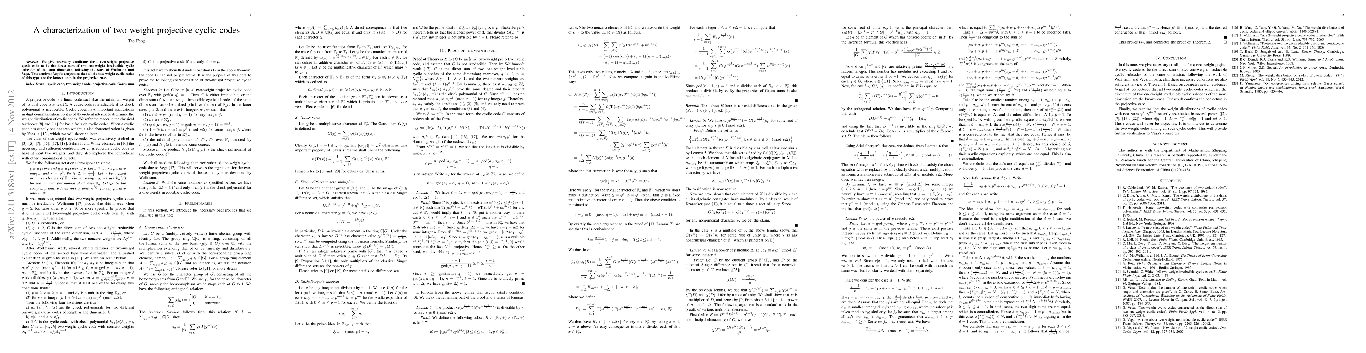 Summary: This paper provides necessary conditions for two-weight projective cyclic codes to be expressible as the direct sum of two one-weight irreducible cyclic subcodes, confirming Vega's conjecture regarding the classification of such codes in the projective case.