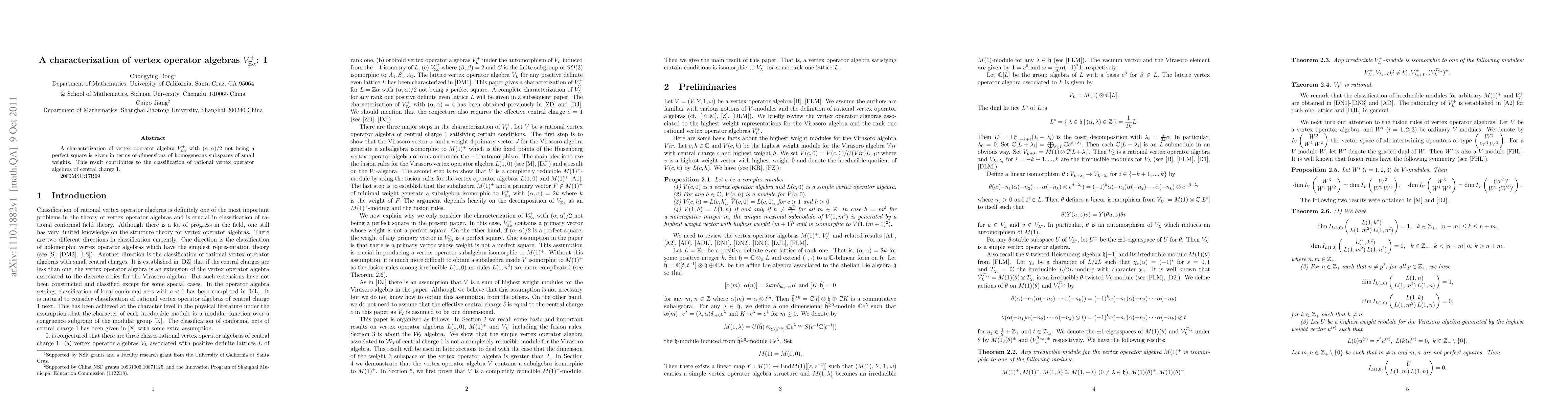 This paper characterizes the vertex operator algebra $V_{Z\alpha}^+$ when $(\alpha,\alpha)/2$ is not a perfect square, using the dimensions of its homogeneous subspaces of small weights. This characterization aids in the classification of rational vertex operator algebras with central charge 1.