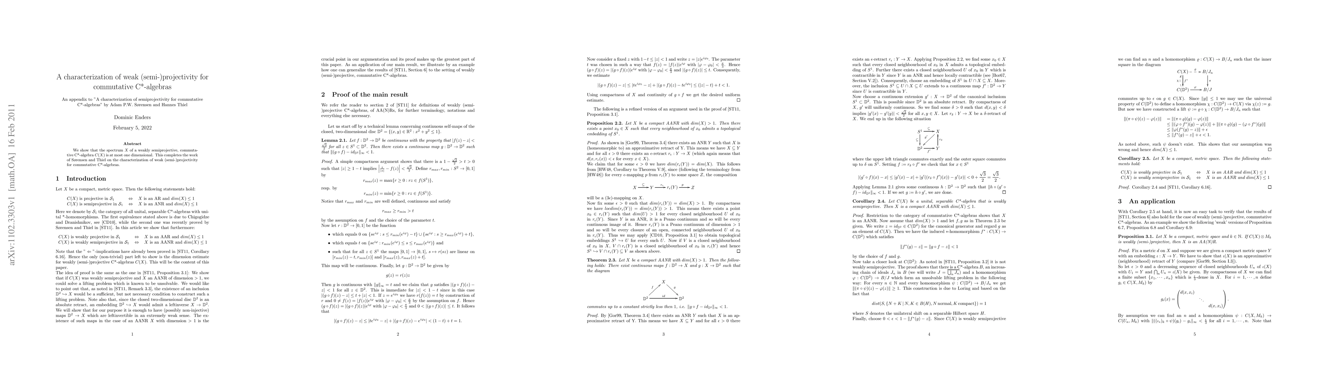 We show that the spectrum X of a weakly semiprojective, commutative C*-algebra C(X) is at most one dimensional. This completes the work of S{\o}rensen and Thiel on the characterization of weak (semi-)projectivity for commutative C*-algebras.
