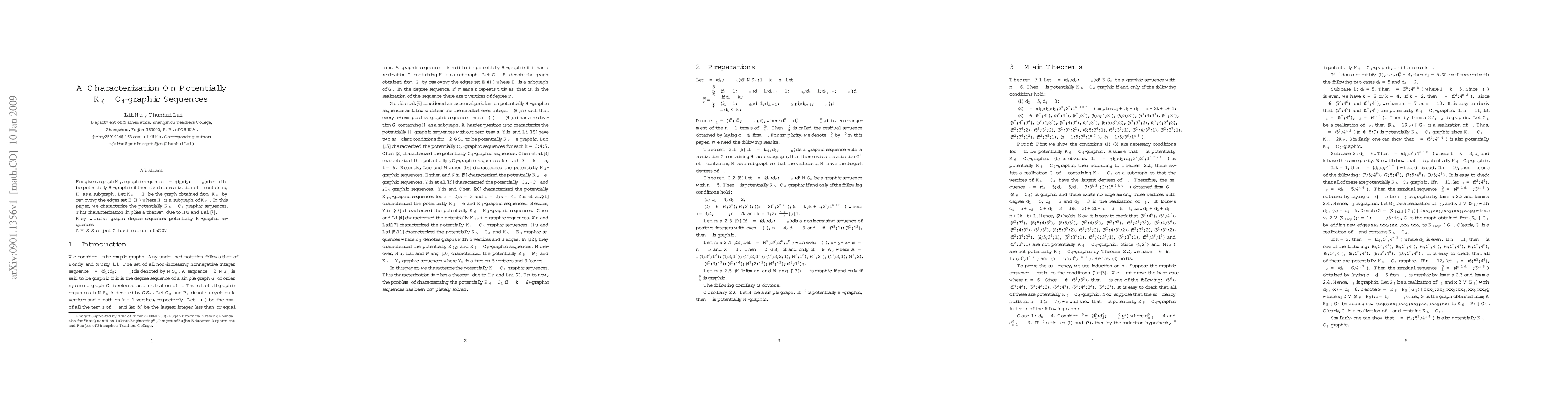 For given a graph $H$, a graphic sequence $\pi=(d_1,d_2,...,d_n)$ is said to be potentially $H$-graphic if there exists a realization of $\pi$ containing $H$ as a subgraph. Let $K_m-H$ be the graph obtained from $K_m$ by removing the edges set $E(H)$ where $H$ is a subgraph of $K_m$. In this paper, we characterize the potentially $K_6-C_4$-graphic sequences. This characterization implies a theorem due to Hu and Lai [7].