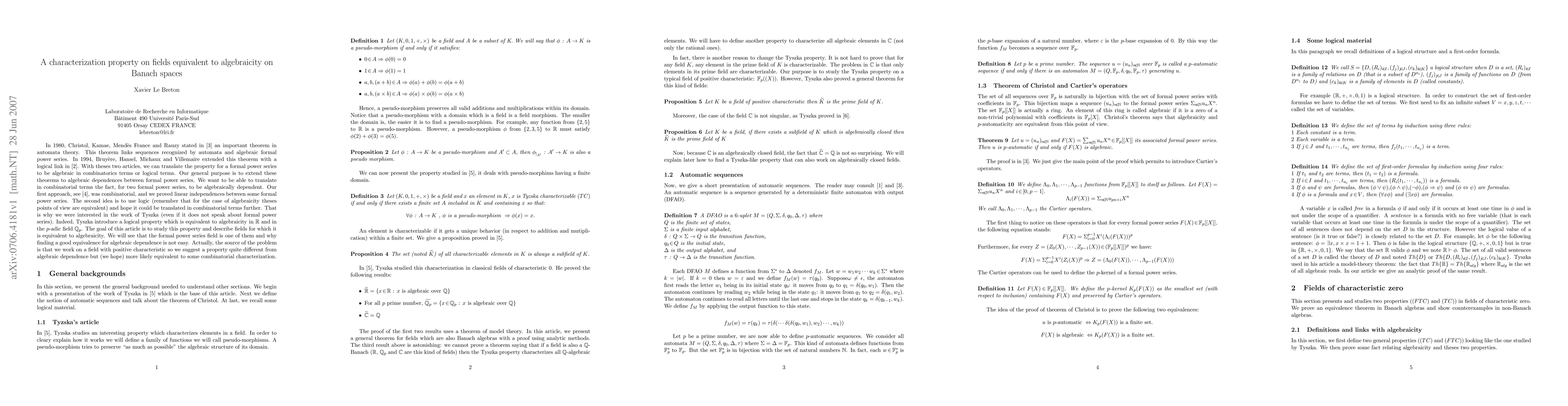 In his article "A discrete form of the theorem that each field endomorphism of $\mathbb{R}$ ($\mathbb{Q}_p$) is the identity", Tyszka introduce a logical property which is equivalent to algebraicity in $\mathbb{R}$ and in $\mathbb{Q}_p$. Amazingly, the property is no longer equivalent to algebraicity in $\mathbb{C}$. This article present a similirar property which is equivalent to algebraicity in any field of characteristic zero which is also a Banach space, and prove a weaker equivalency for fields of positive charcteristic (which are also Banach spaces).