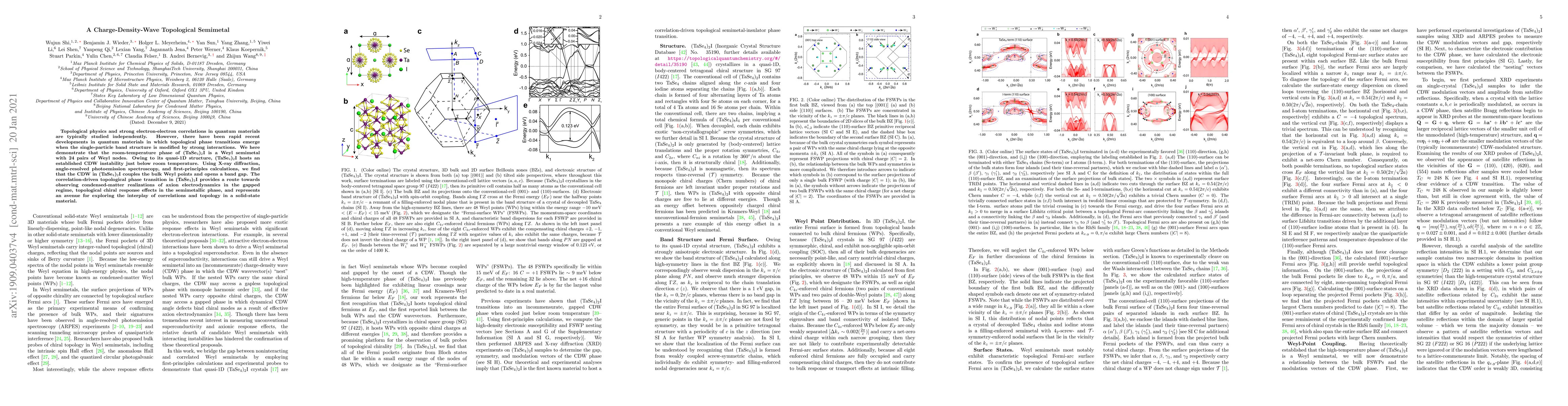 Topological physics and strong electron-electron correlations in quantum materials are typically studied independently. However, there have been rapid recent developments in quantum materials in which topological phase transitions emerge when the single-particle band structure is modified by strong interactions. We here demonstrate that the room-temperature phase of (TaSe$_4$)$_2$I is a Weyl semimetal with 24 pairs of Weyl nodes. Owing to its quasi-1D structure, (TaSe$_4$)$_2$I hosts an established CDW instability just below room temperature. Using X-ray diffraction, angle-resolved photoemission spectroscopy, and first-principles calculations, we find that the CDW in (TaSe$_4$)$_2$I couples the bulk Weyl points and opens a band gap. The correlation-driven topological phase transition in (TaSe$_4$)$_2$I provides a route towards observing condensed-matter realizations of axion electrodynamics in the gapped regime, topological chiral response effects in the semimetallic phase, and represents an avenue for exploring the interplay of correlations and topology in a solid-state material.